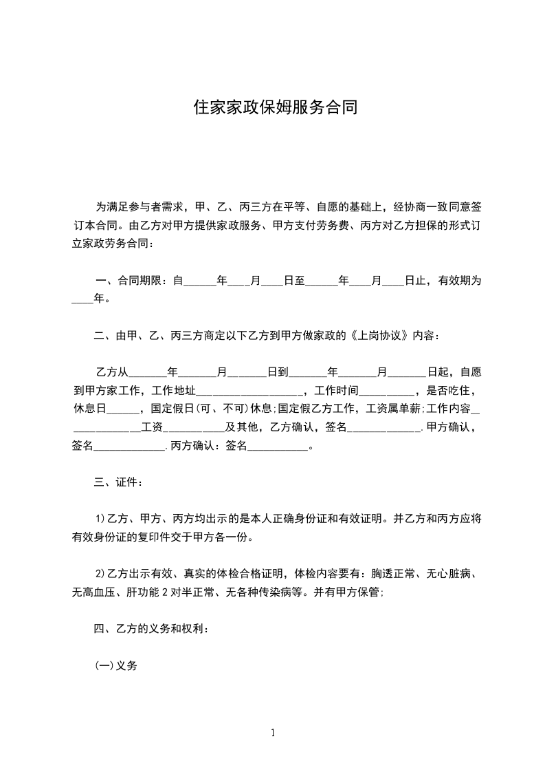 1、尊重和维护甲方、丙方的合法权利,自觉履行本合同规定的家政服务项目,热诚服务。