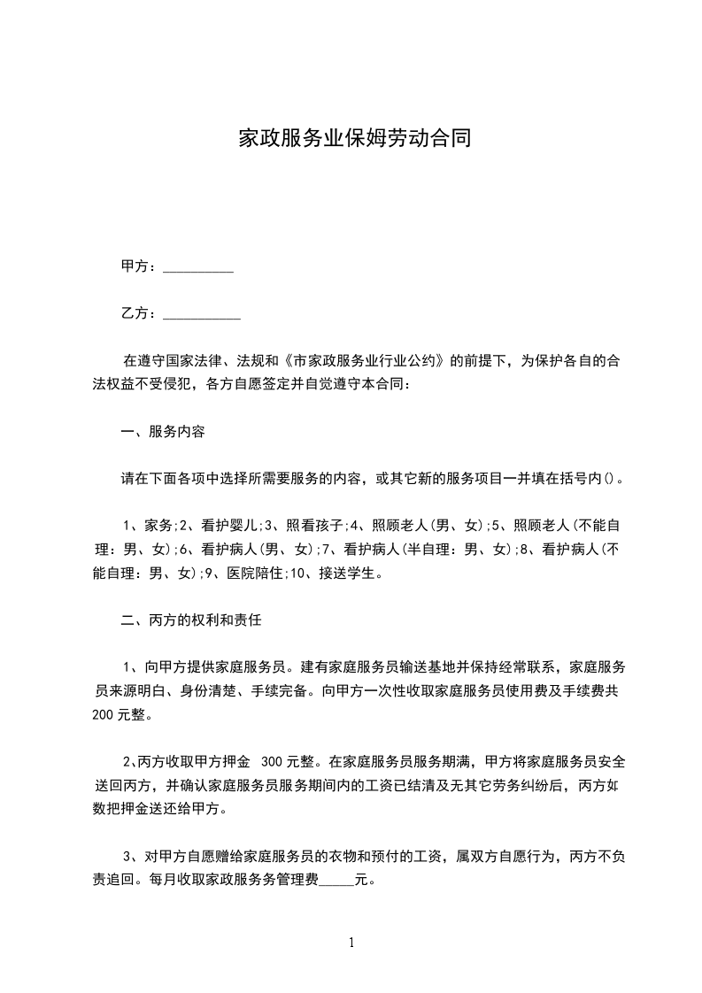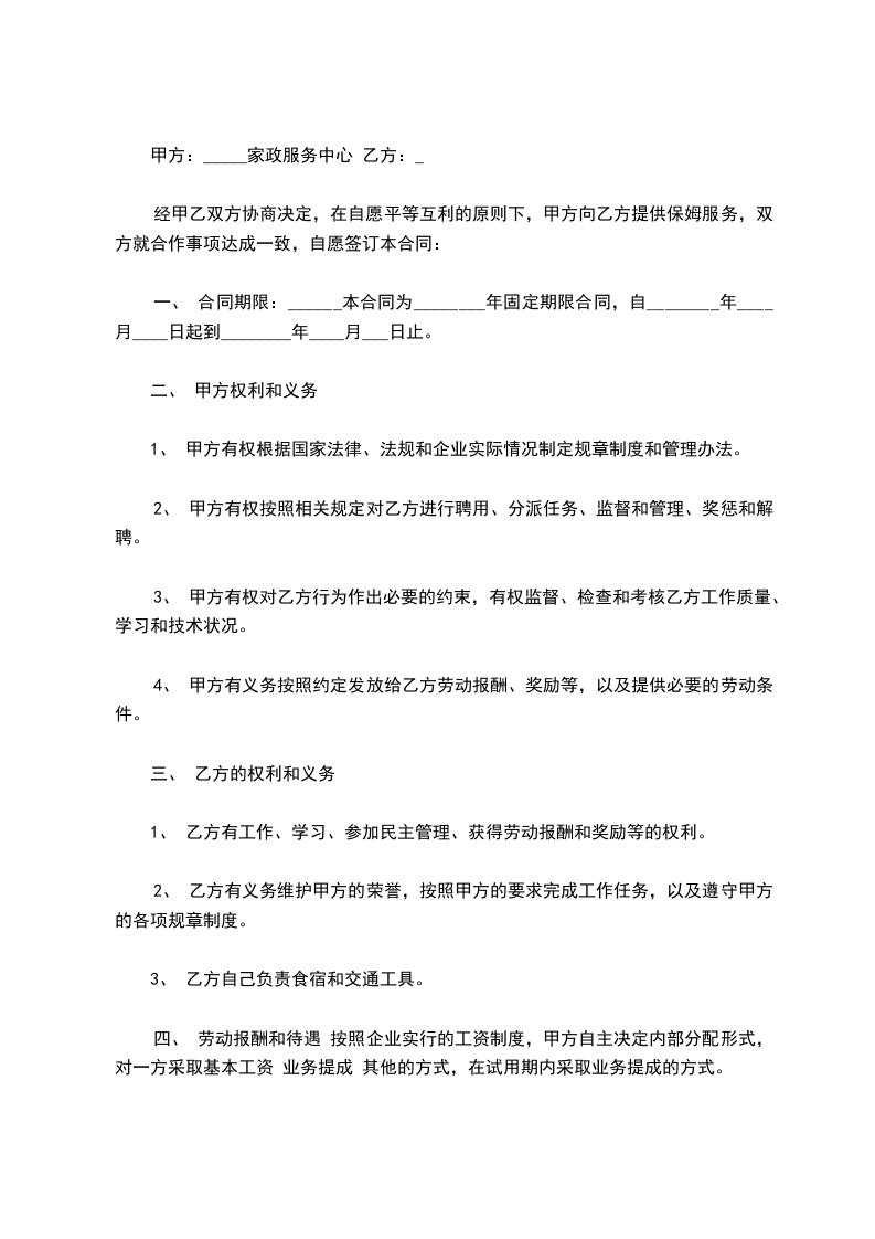 1、向甲方提供家庭服务员。建有家庭服务员输送基地并保持经常联系,家庭服务员来源明白、身份清楚、手续完备。向甲方一次性收取家庭服务员使用费及手续费共200元整。