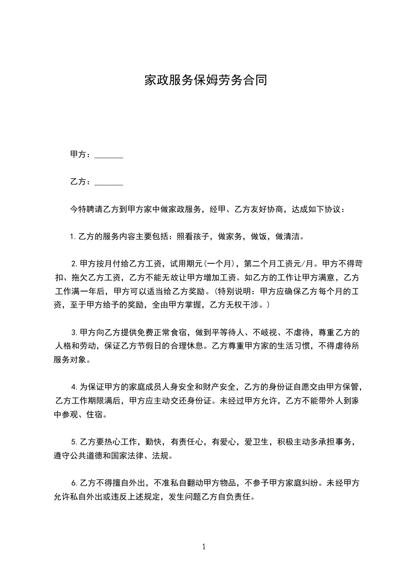 6、不得参与甲方家庭及邻纠纷,尊重甲方家的生活习惯,不得虐待所服务对象。
