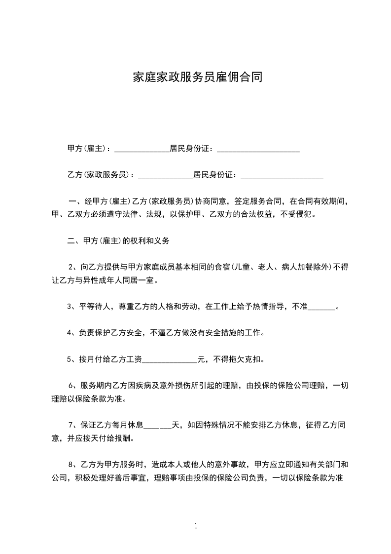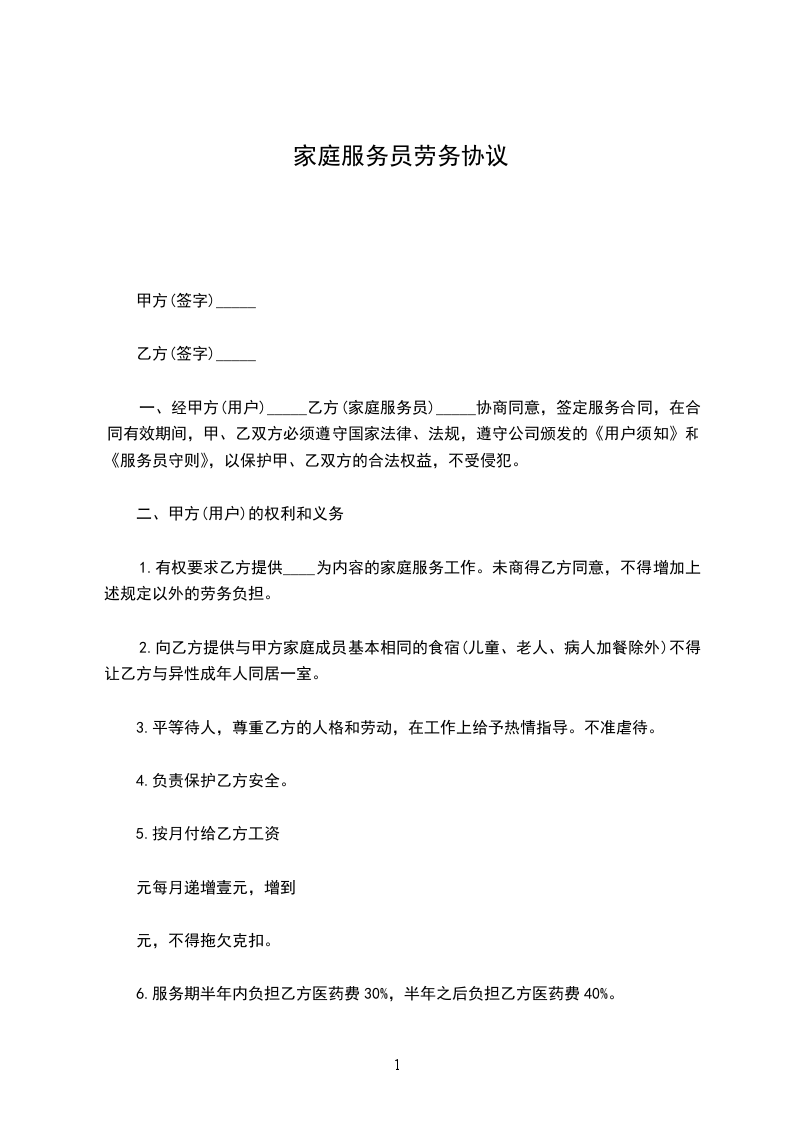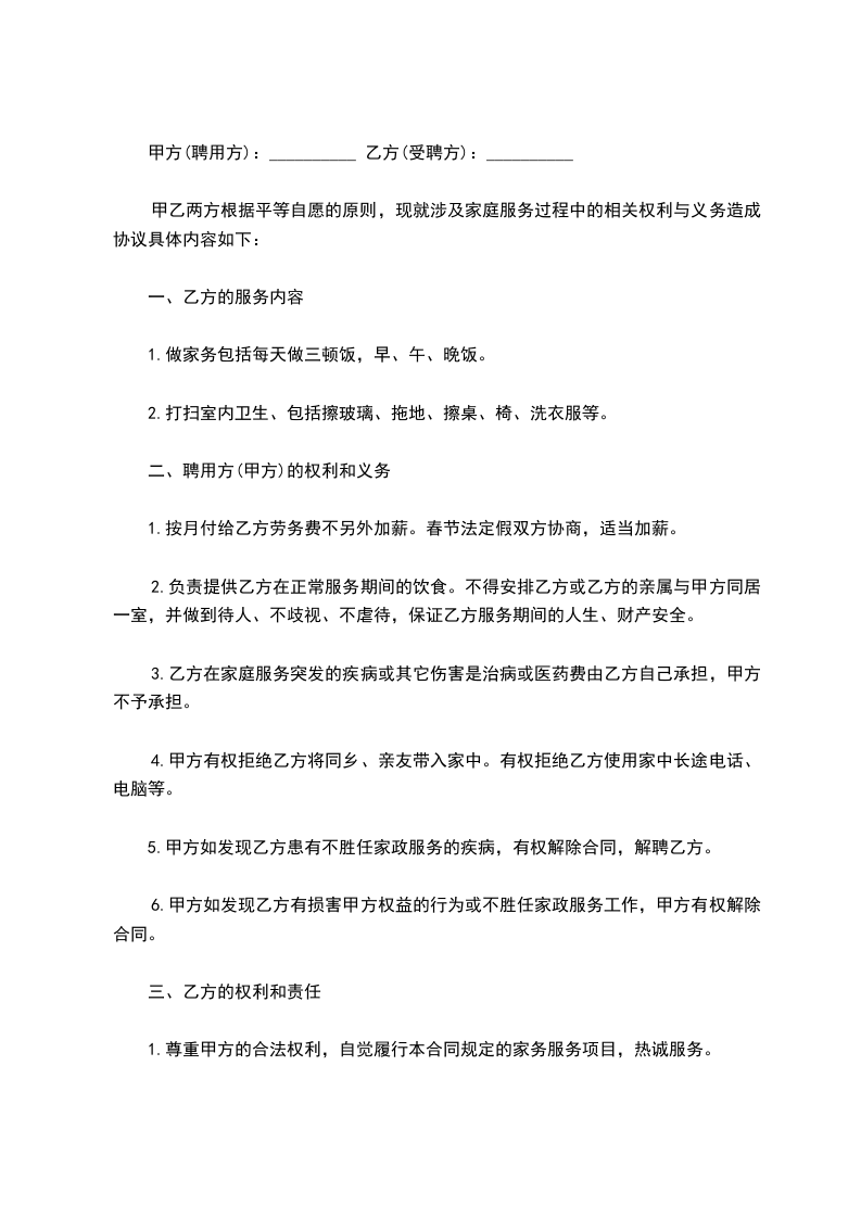 6、不得参与甲方家庭及邻纠纷,尊重甲方家的生活习惯,不得虐待所服务对象。