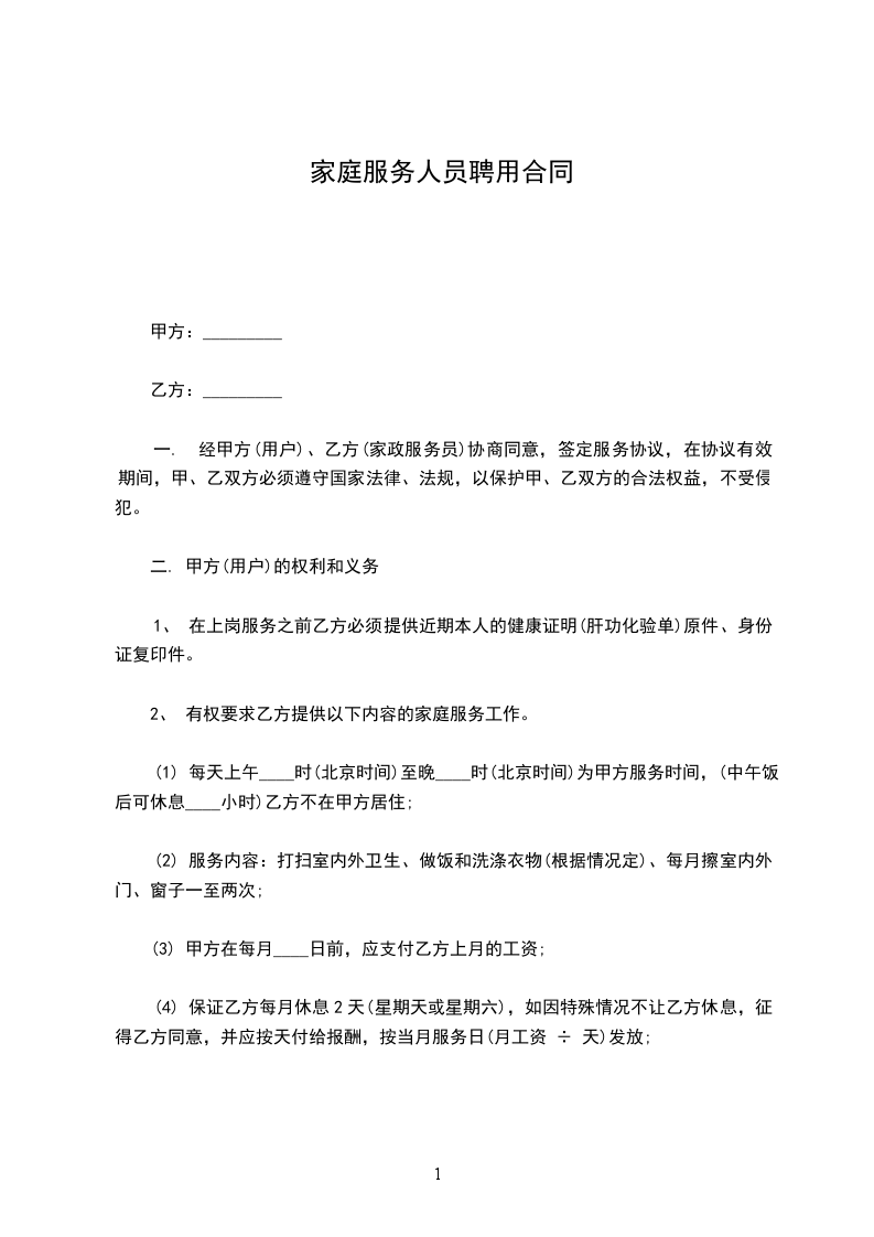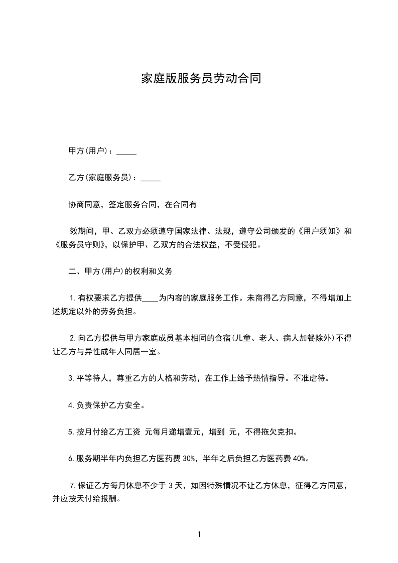 1、及时按月付给家庭服务员足额的劳务工资_______元整(具体工资数额在签定本合同时,由双方协商而定)。家庭服务员休息日每月不少于三天,遇国家规定的节、假日,不能休息的,双方协商,适当加薪。不得拖欠或扣发家庭服务员的工资。