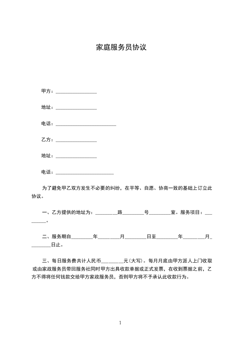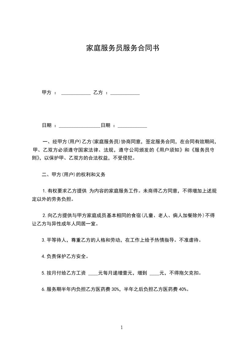 1、向甲方提供家庭服务员。建有家庭服务员输送基地并保持经常联系,家庭服务员来源明白、身份清楚、手续完备。向甲方一次性收取家庭服务员使用费及手续费共200元整。