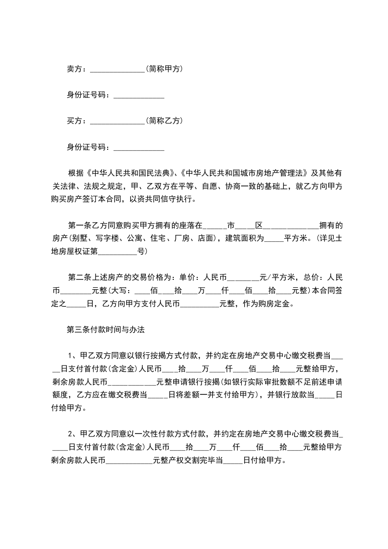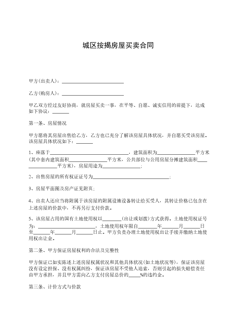 第一条乙方同意购买甲方拥有的座落在______市_____区________________________拥有的房产(别墅、写字楼、公寓、住宅、厂房、店面),建筑面积为_____平方米。(详见土地房屋权证第_______________号)。