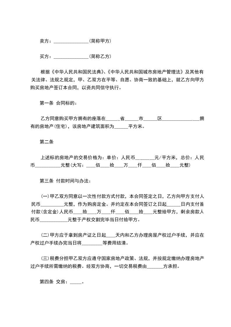 第二条 上述房产的交易价格为:单价:人民币________元/平方米,总价:人民币___________元整(大写:____佰____拾 ____万____仟____佰____拾____元整)。本合同签定之日,乙方向甲方支付人民币__________元整,作为购房定金。