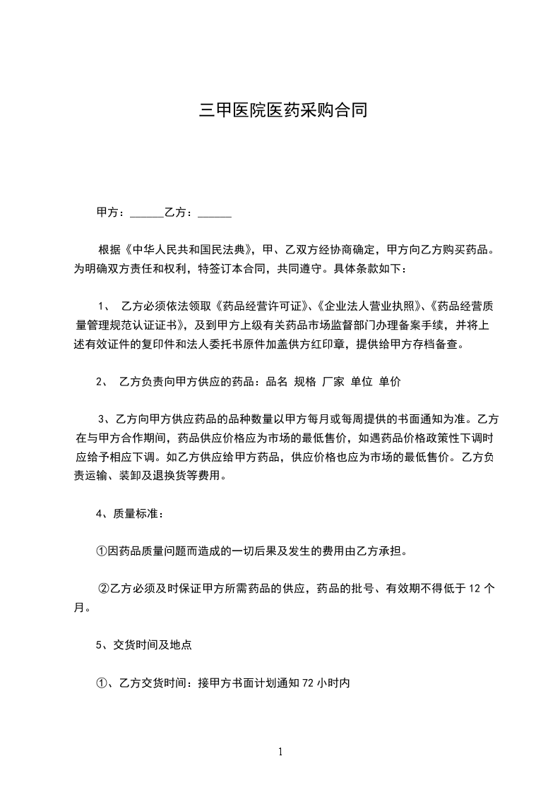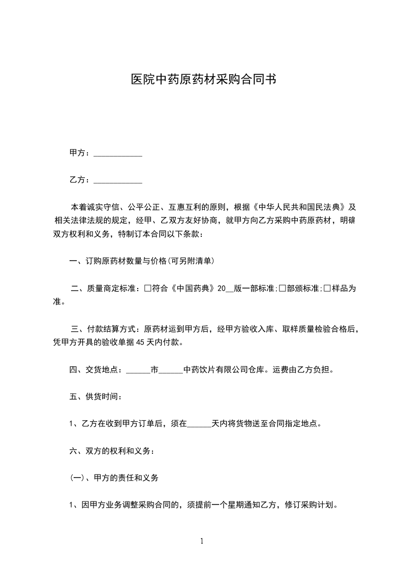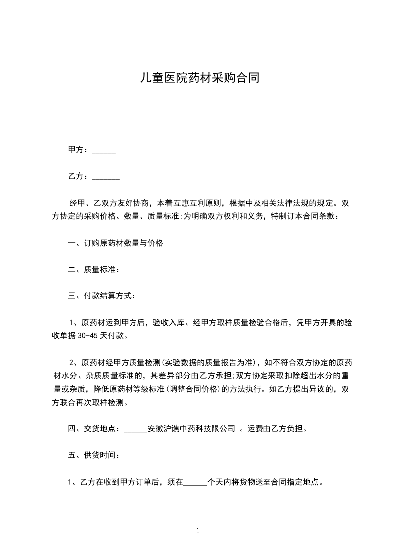 1、每次下达采购订单合同时,当质量标准无法确定的,以甲方提供的原药材样品为执行的质量标准,并一式两份,由甲乙双方共同保管。