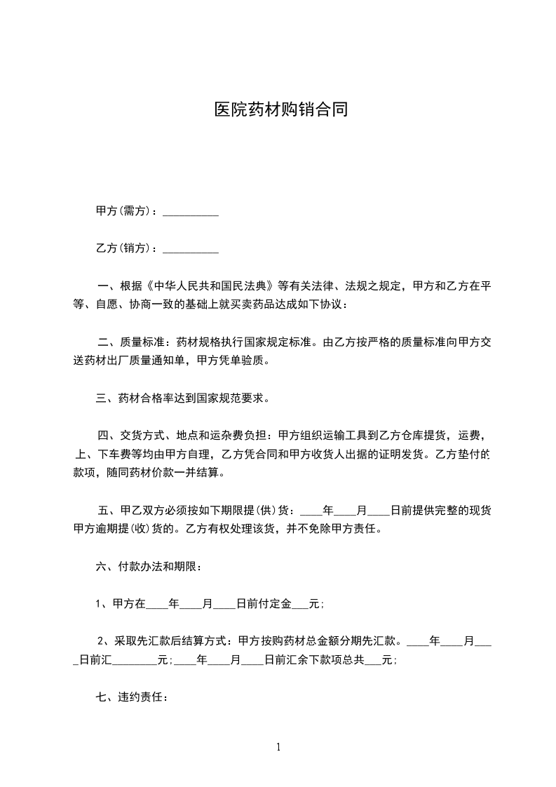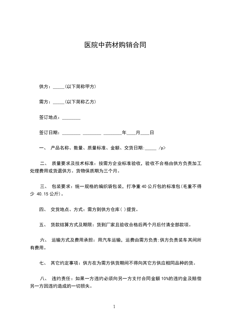 1、乙方须以签订的合同条款,如期将原药材运至合同规定的地方。如乙不能如期交货的,需提前一个星期通知甲方,如未提前告知的,影响甲方正常的生产经营的,乙方将按所签订合同货物款的3%支付甲方违约金。