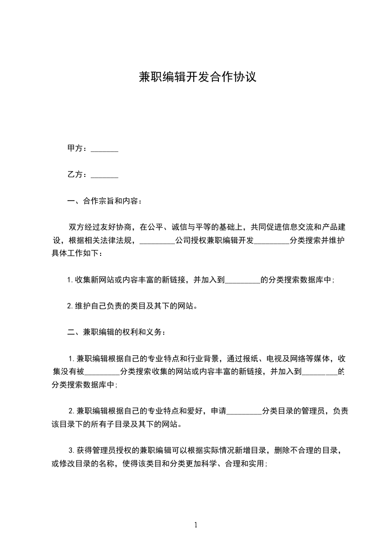 双方经过友好协商,在公平、诚信与平等的基础上,共同促进信息交流和产品建设,根据相关法律法规,_________公司授权兼职编辑开发_________分类搜索并维护。具体工作如下: