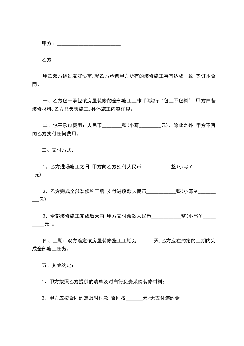 3、全部装修施工完成后天内,甲方支付余款人民币____________整(小写¥__________元)。