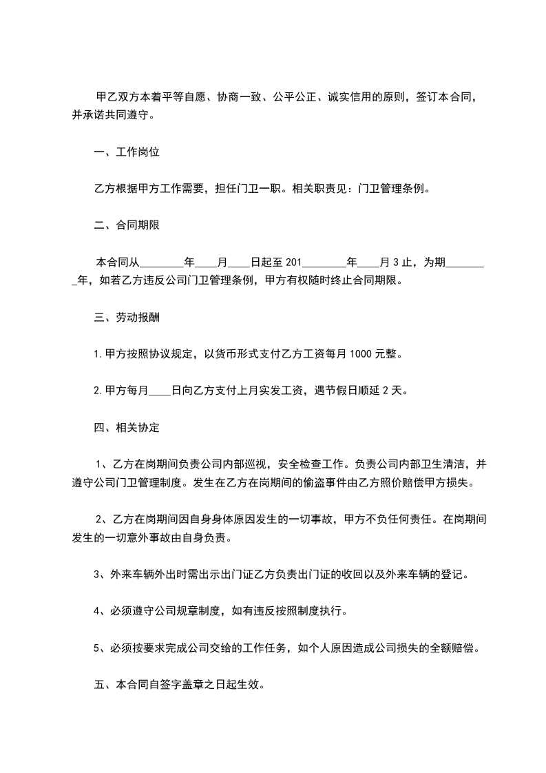 本合同从________年____月____日起至201________年____月3止,为期________年,如若乙方违反公司门卫管理条例,甲方有权随时终止合同期限。
