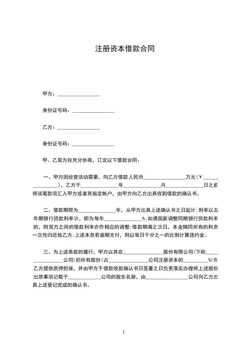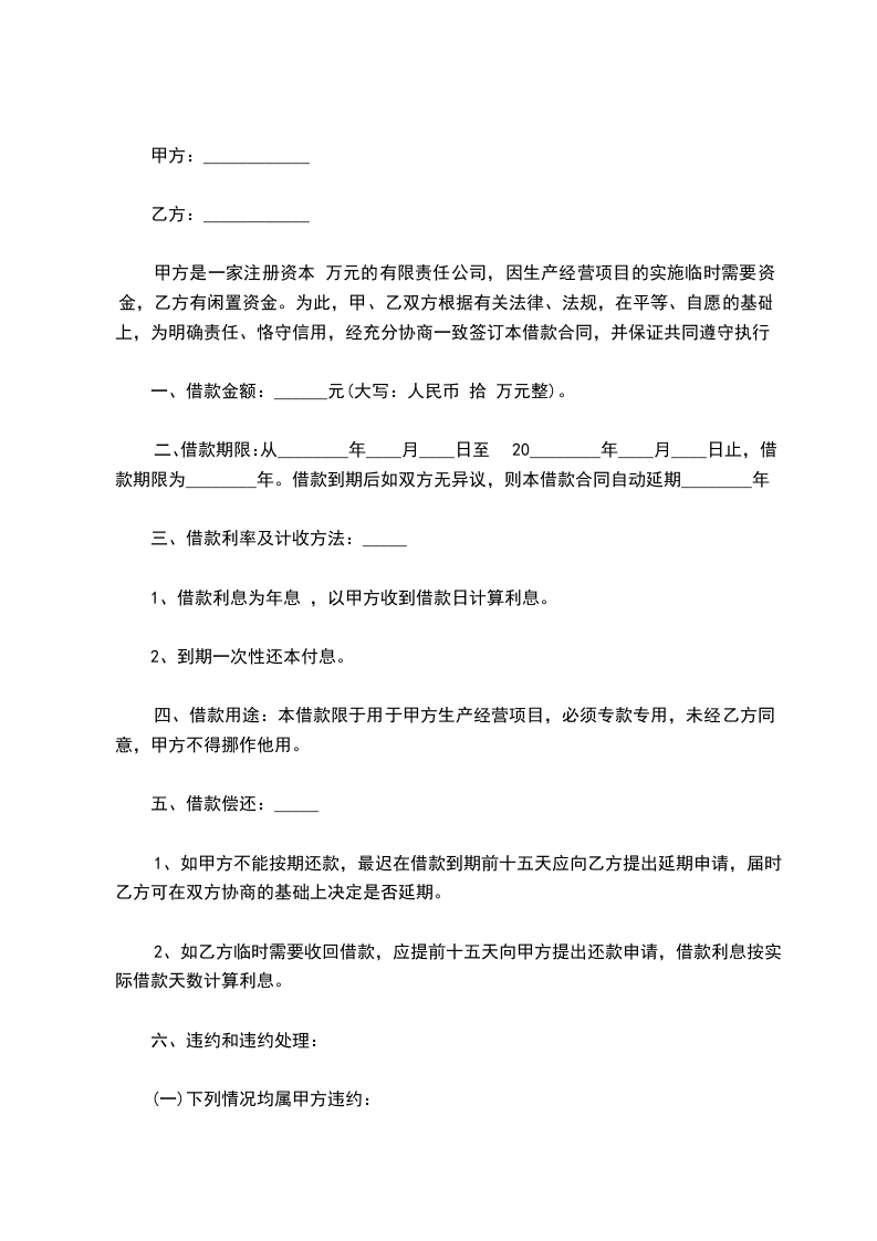 甲方是一家注册资本 万元的有限责任公司,因生产经营项目的实施临时需要资金,乙方有闲置资金。为此,甲、乙双方根据有关法律、法规,在平等、自愿的基础上,为明确责任、恪守信用,经充分协商一致签订本借款合同,并保证共同遵守执行。