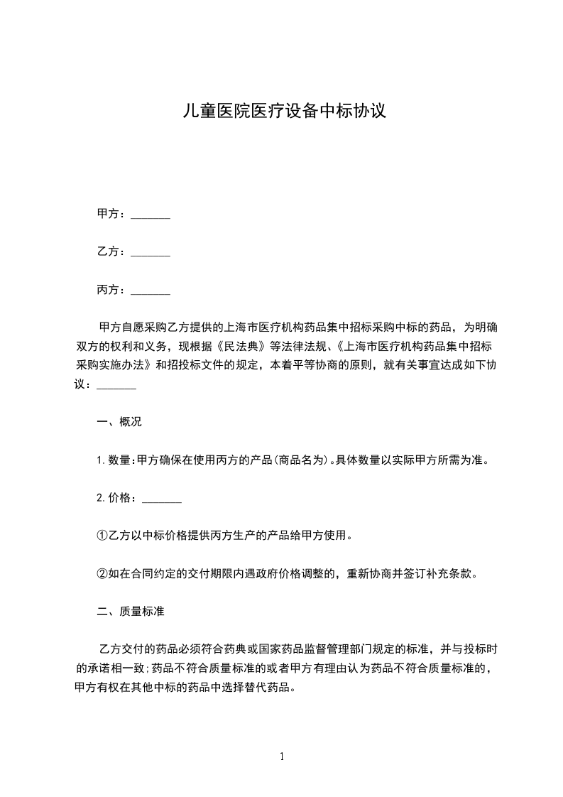 甲方自愿采购乙方提供的上海市医疗机构药品集中招标采购中标的药品,为明确双方的权利和义务,现根据《民法典》等法律法规、《上海市医疗机构药品集中招标采购实施办法》和招投标文件的规定,本着平等协商的原则,就有关事宜达成如下协议:_______