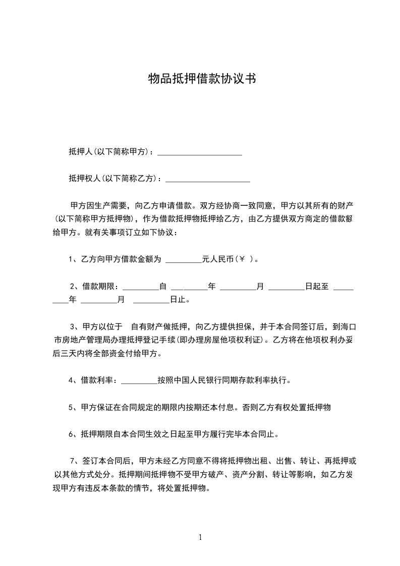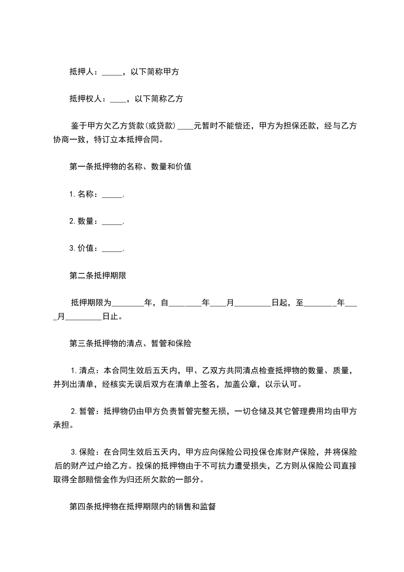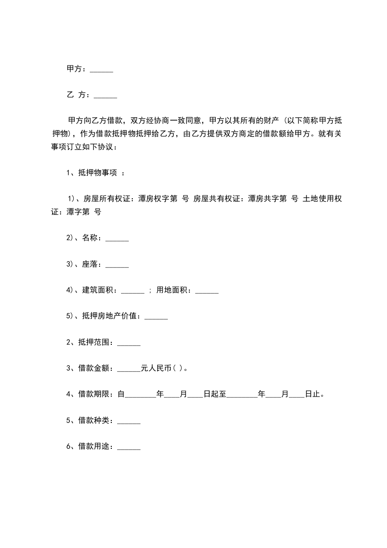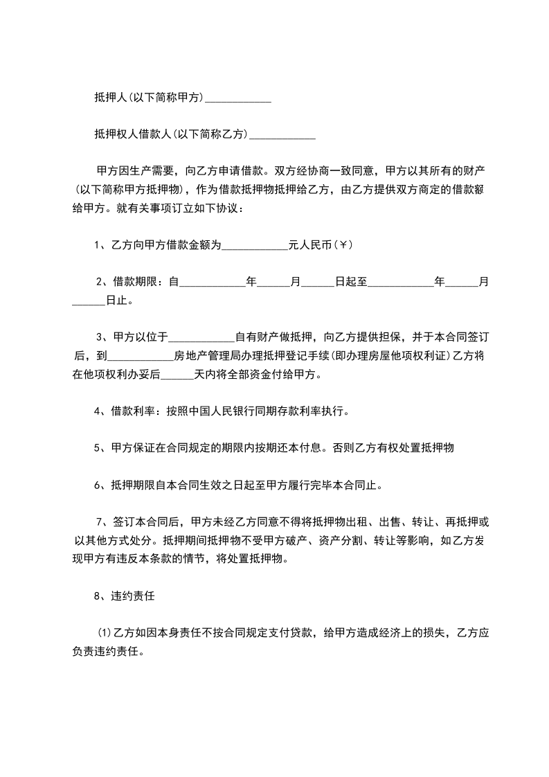 (一)借款方用__________________做抵押,到期不能归还贷款方的贷款,贷款方有权处理抵押品。借款方到期如数归还贷款的,抵押权消灭。