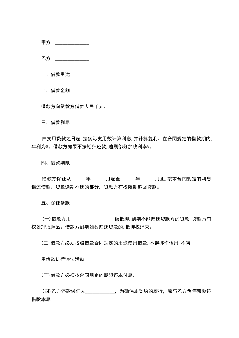(四)乙方还款保证人____________,为确保本契约的履行,愿与乙方负连带返还借款本息