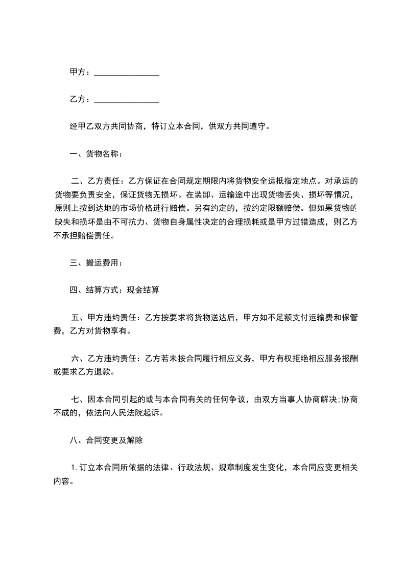二、乙方责任:乙方保证在合同规定期限内将货物安全运抵指定地点。对承运的货物要负责安全,保证货物无损坏。在装卸、运输途中出现货物丢失、损坏等情况,原则上按到达地的市场价格进行赔偿。另有约定的,按约定限额赔偿。但如果货物的缺失和损坏是由不可抗力、货物自身属性决定的合理损耗或是甲方过错造成,则乙方不承担赔偿责任。