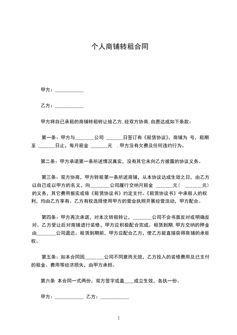 甲方将自已承租的商铺转租转让给乙方,经双方协商,自愿达成如下条款: