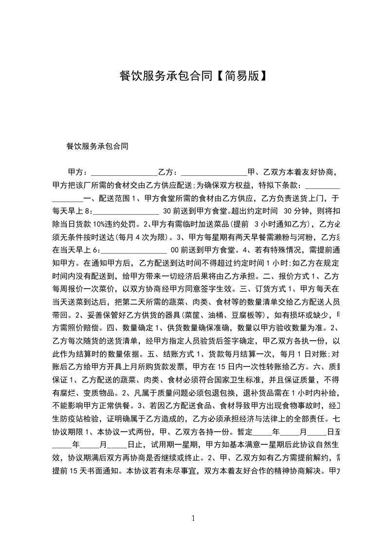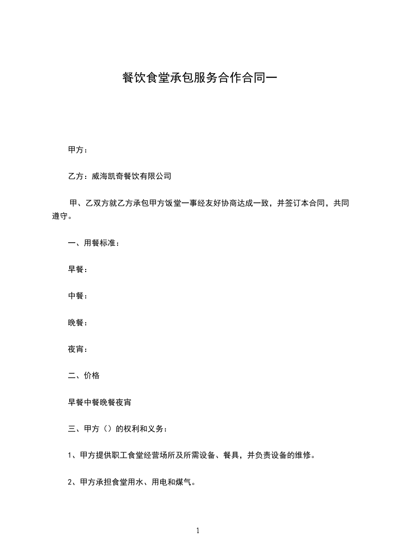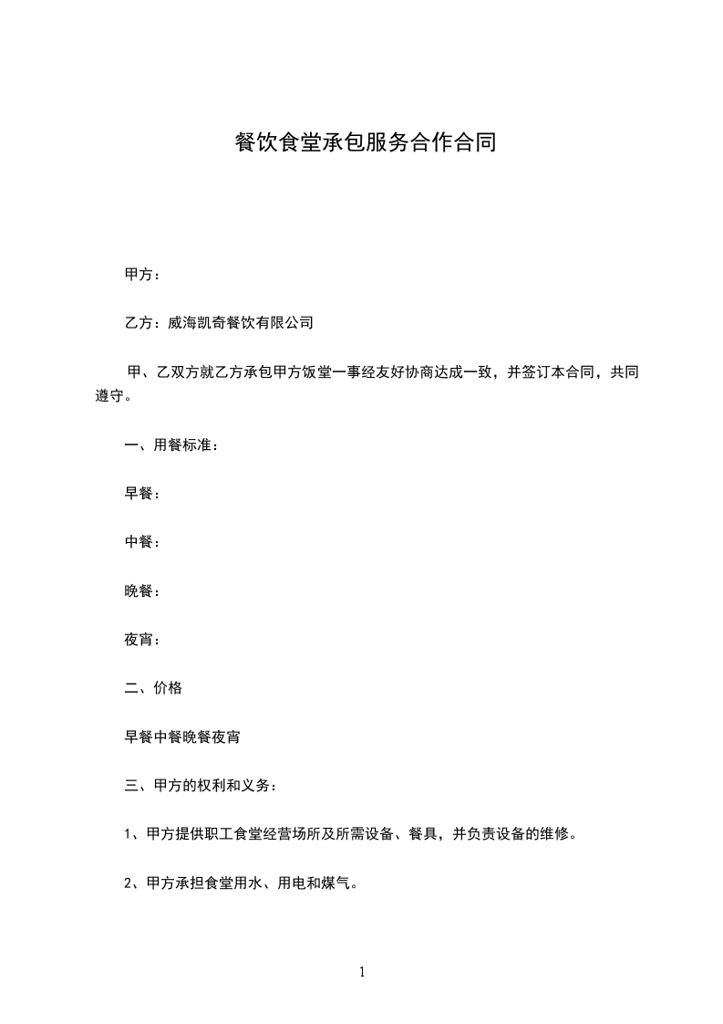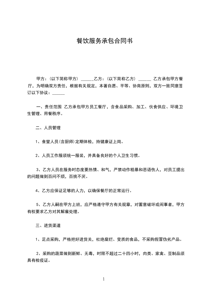 一、责任范围 乙方承包甲方员工餐厅,含食品采购、加工、伙食供应、环境卫生管理、用餐秩序。