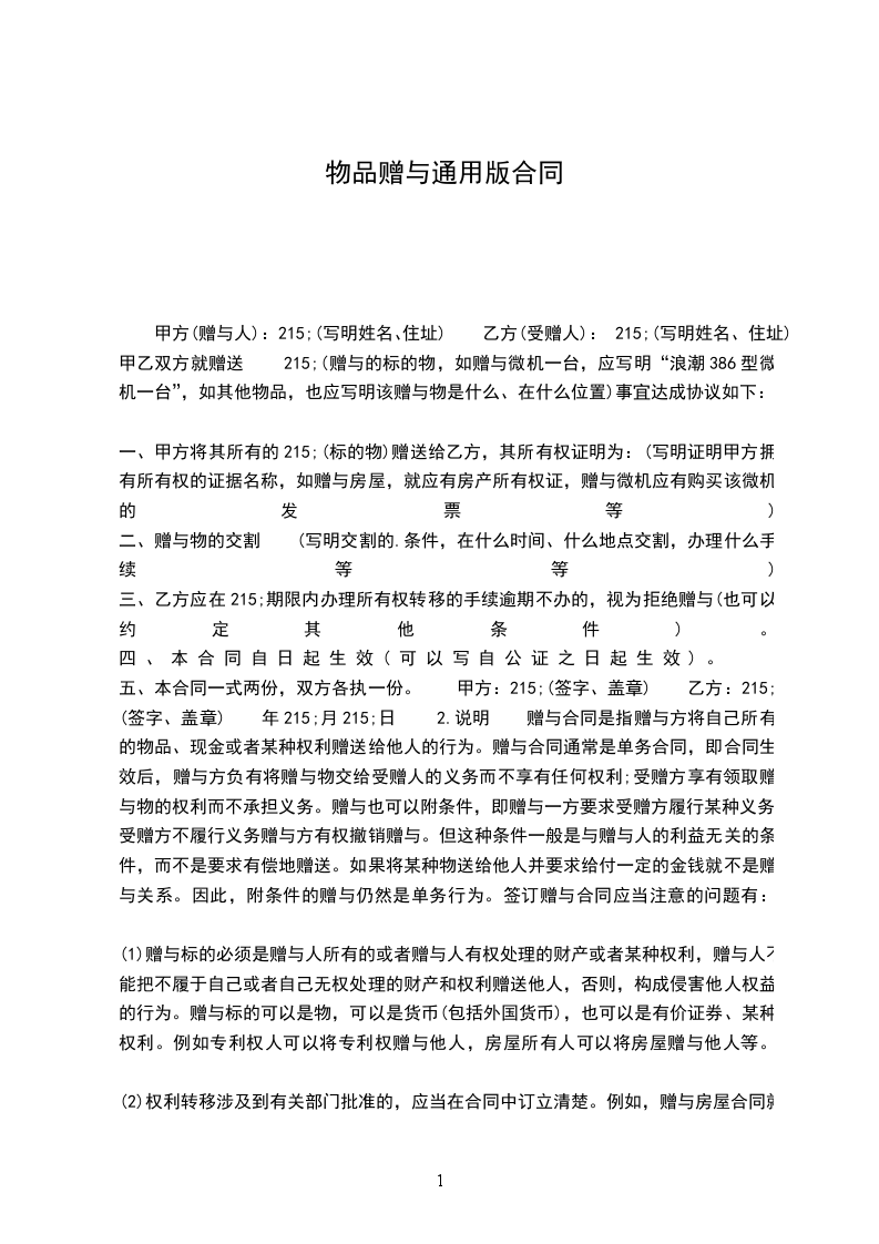 五、本合同一式两份,双方各执一份。 甲方:215;(签字、盖章) 乙方:215;(签字、盖章) 年215;月215;日 2.说明 赠与合同是指赠与方将自己所有的物品、现金或者某种权利赠送给他人的行为。赠与合同通常是单务合同,即合同生效后,赠与方负有将赠与物交给受赠人的义务而不享有任何权利;受赠方享有领取赠与物的权利而不承担义务。赠与也可以附条件,即赠与一方要求受赠方履行某种义务,受赠方不履行义务赠与方有权撤销赠与。但这种条件一般是与赠与人的利益无关的条件,而不是要求有偿地赠送。如果将某种物送给他人并要求给付一定的金钱就不是赠与关系。因此,附条件的赠与仍然是单务行为。签订赠与合同应当注意的问题有: