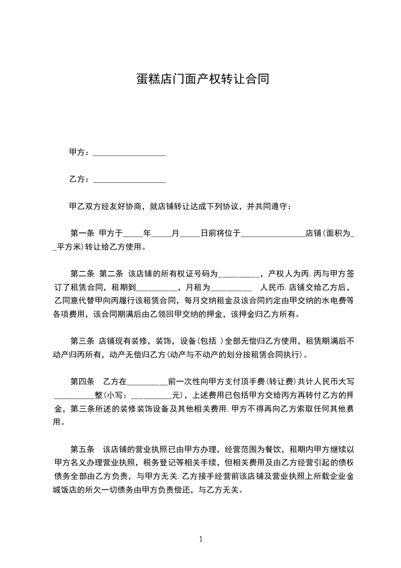 第一条 甲方于_____年_____月_____日前将位于________________店铺(面积为__平方米)转让给乙方使用。