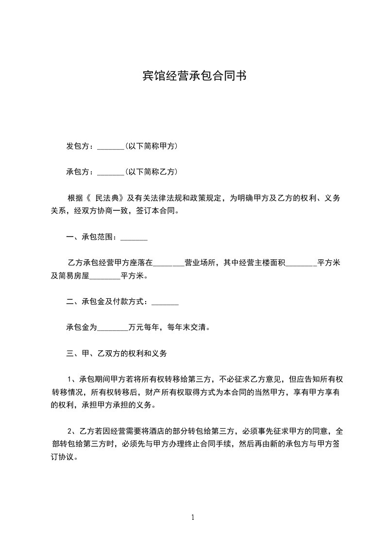 2、乙方若因经营需要将酒店的部分转包给第三方,必须事先征求甲方的同意,全部转包给第三方时,必须先与甲方办理终止合同手续,然后再由新的承包方与甲方签订协议。