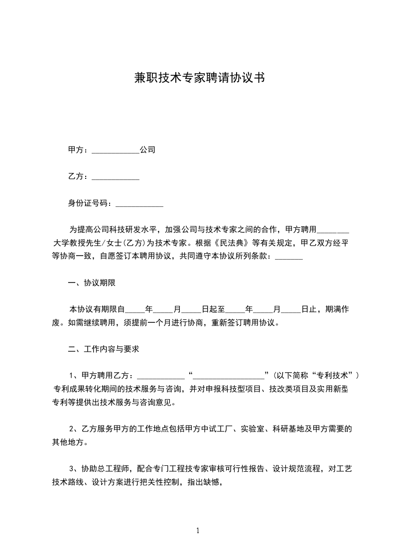 为提高公司科技研发水平,加强公司与技术专家之间的合作,甲方聘用________大学教授先生/女士(乙方)为技术专家。根据《民法典》等有关规定,甲乙双方经平等协商一致,自愿签订本聘用协议,共同遵守本协议所列条款:_______
