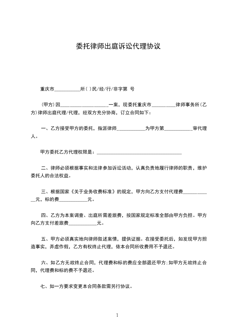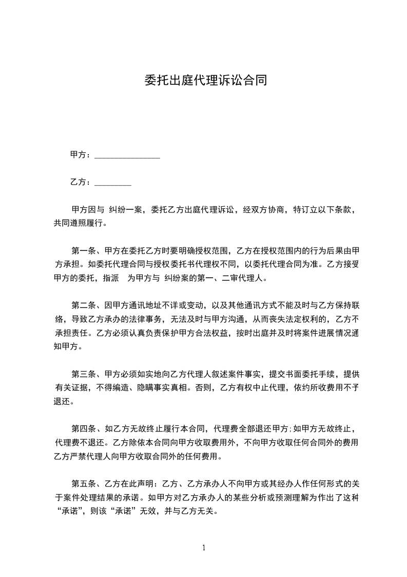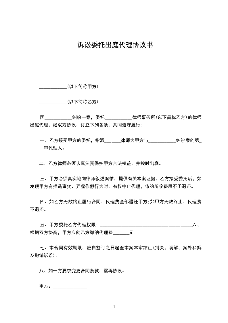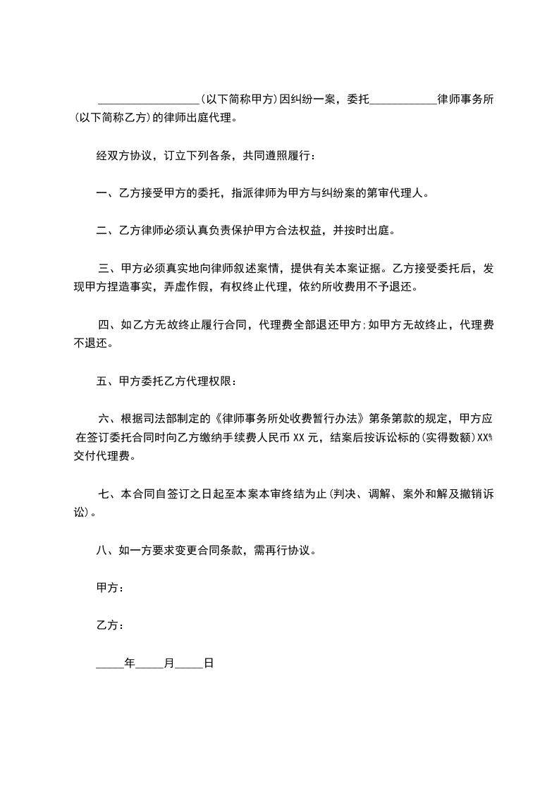 ____________(以下简称甲方)因____________纠纷一案,委托____________律师事务所(以下简称乙方)的律师出庭代理,经双方协议,订立下列各条,共同遵守履行:
