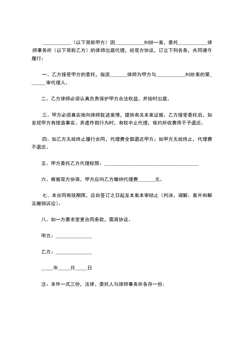 注:本件一式三份,法律、委托人与律师事务所各存一份。