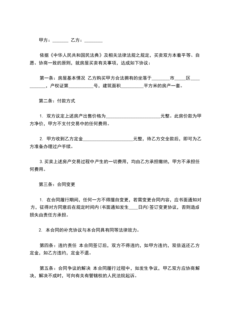 依据《中华人民共和国民法典》及相关法律法规之规定,买卖双方本着平等、自愿、协商一致的原则,就房屋买卖有关事项,达成如下协议: