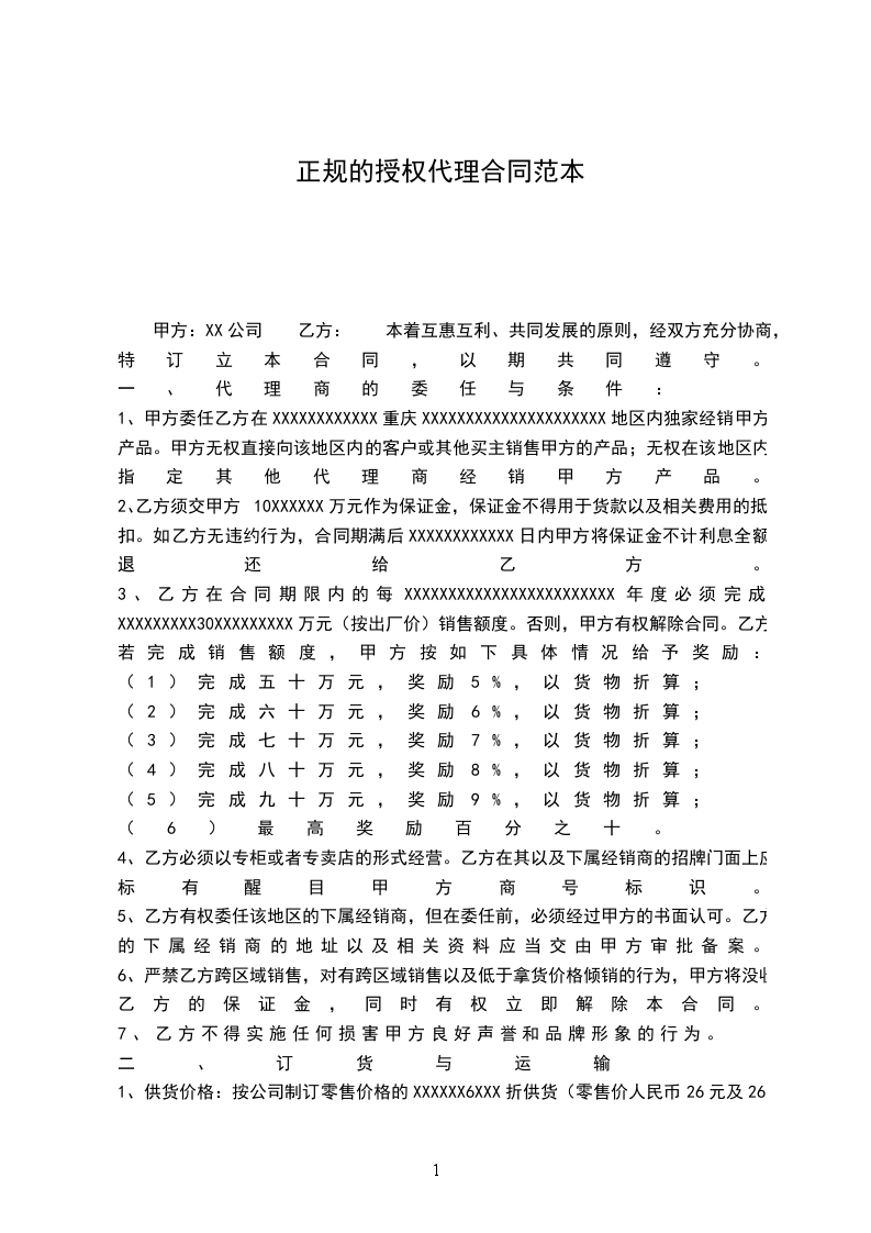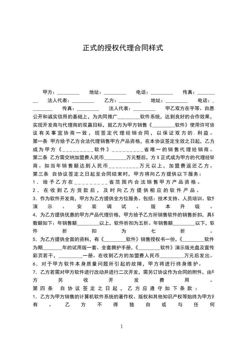 1.4乙方成为正式代理商后,在指定区域内为甲方唯一代理,甲方不得有其他代理商参与乙方竞争。