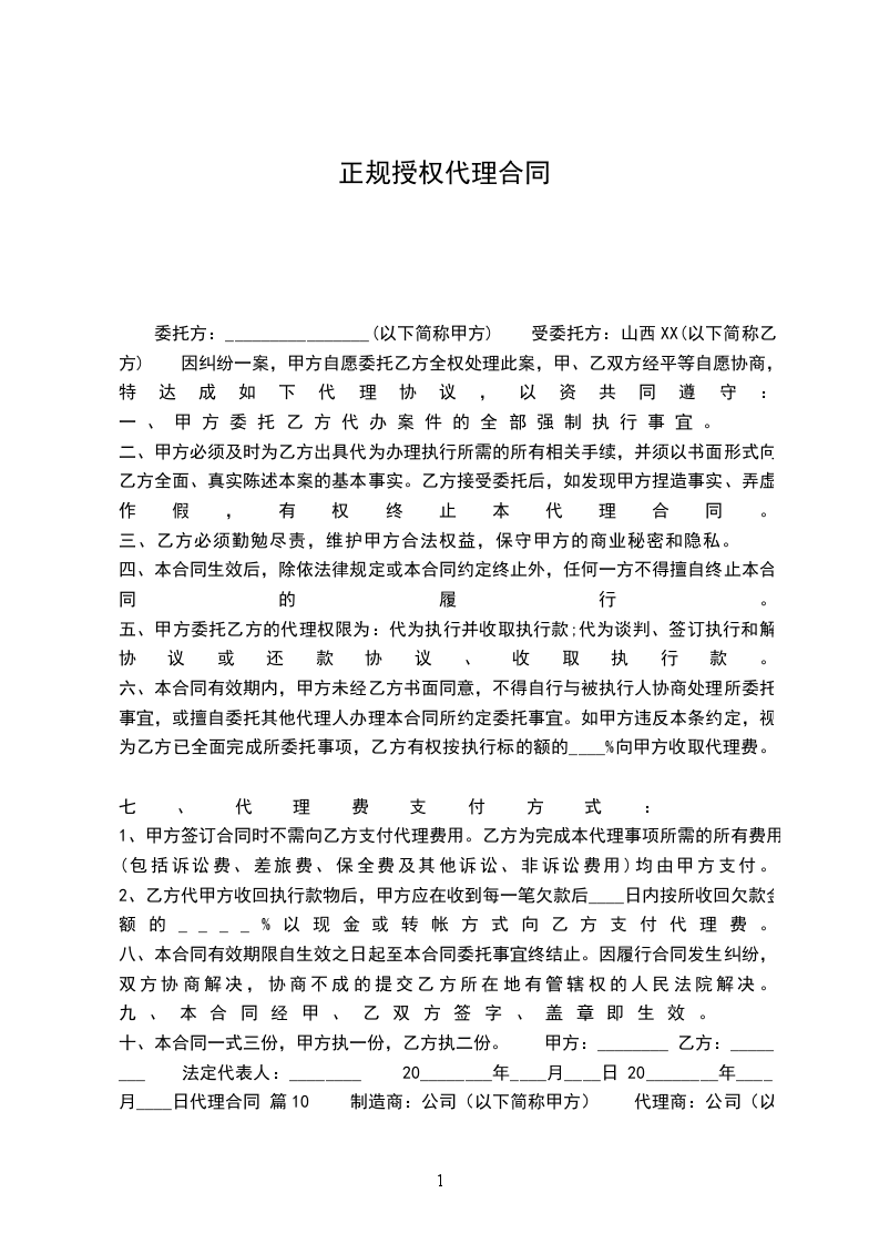 十、本合同一式三份,甲方执一份,乙方执二份。 甲方:________ 乙方:________ 法定代表人:________ 20________年____月____日 20________年____月____日代理合同 篇10 制造商:公司(以下简称甲方) 代理商:公司(以下简称乙方) 甲乙双方经友好协商,就乙方在指定区域独家代理甲方产品达成以下协议: