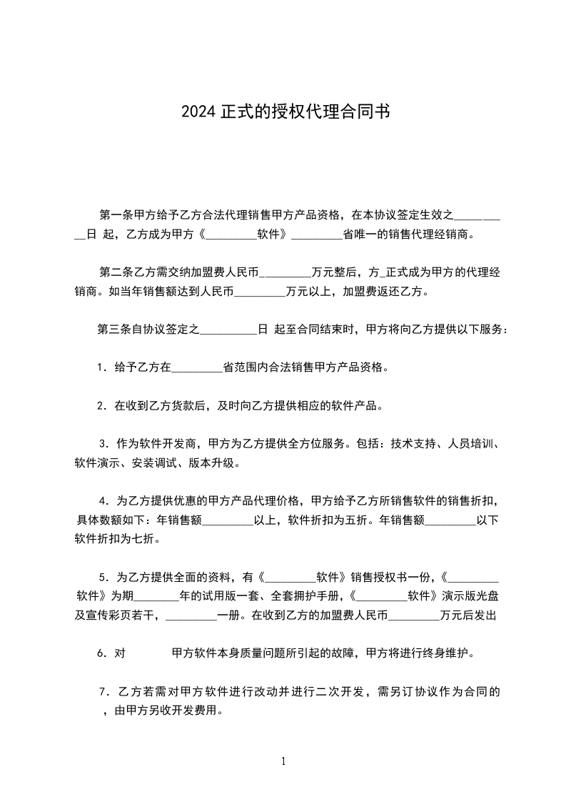 1.3本合同生效后________年内,乙方成为甲方临时代理商。临时代理商除区域独家代理权外,享受同正式代理商一样的权利。甲、乙双方合作期满________年后,由甲方签发独家代理证书,自此乙方在指定区域内享受独家代理权。