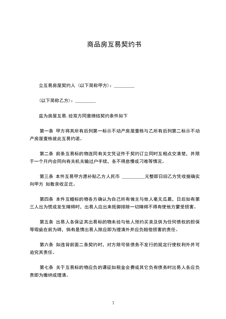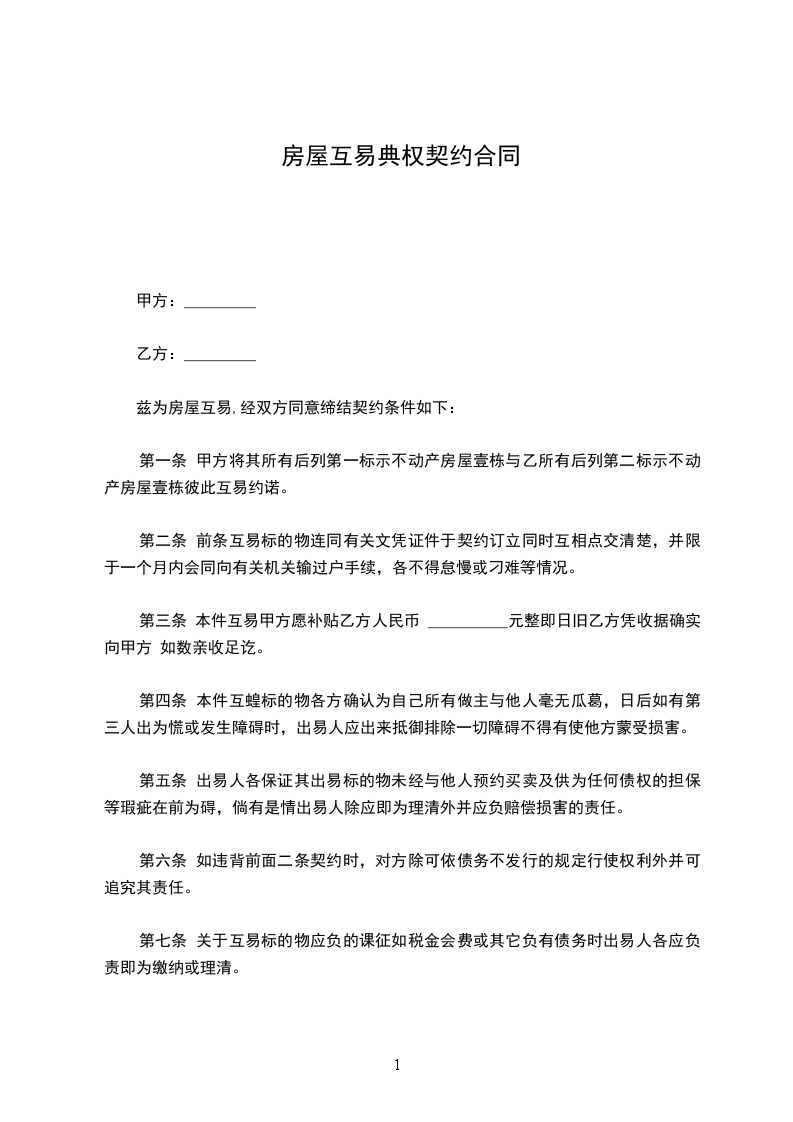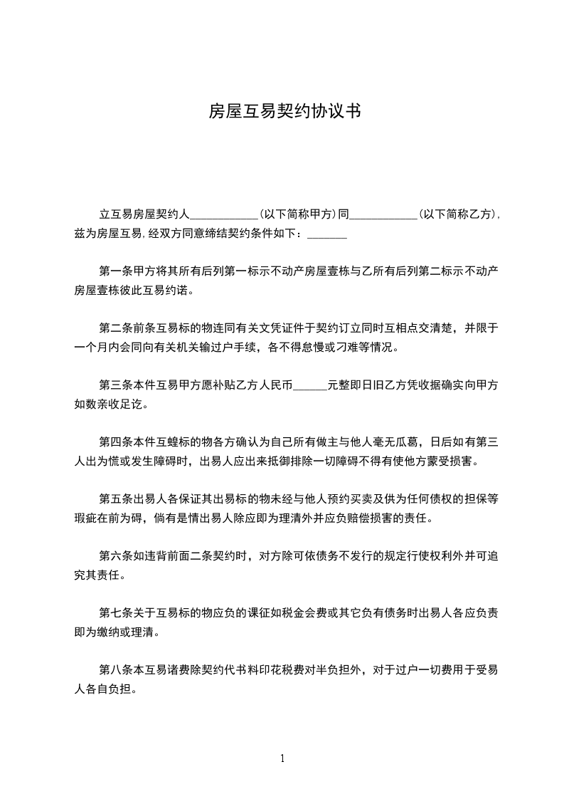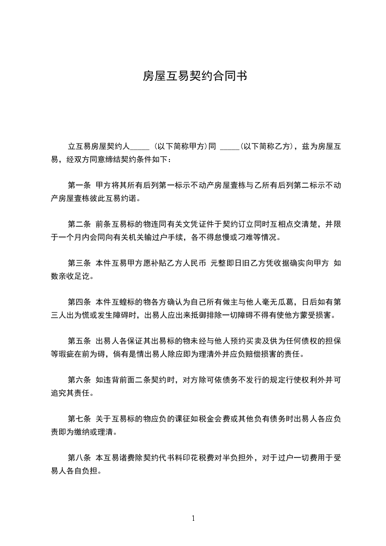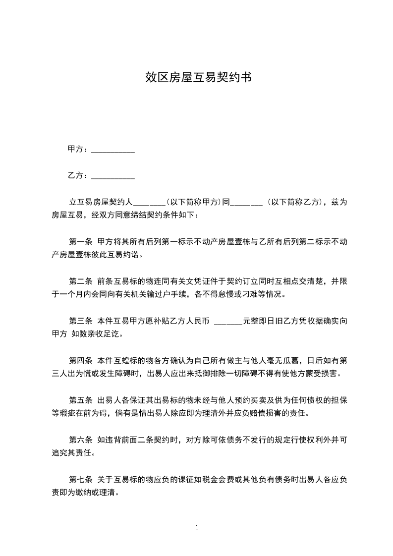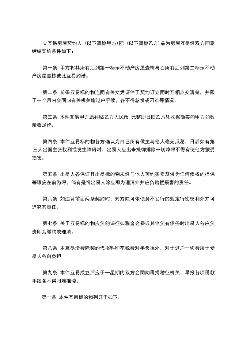 立互易房屋契约人________(以下简称甲方)同________ (以下简称乙方),兹为房屋互易,经双方同意缔结契约条件如下:
