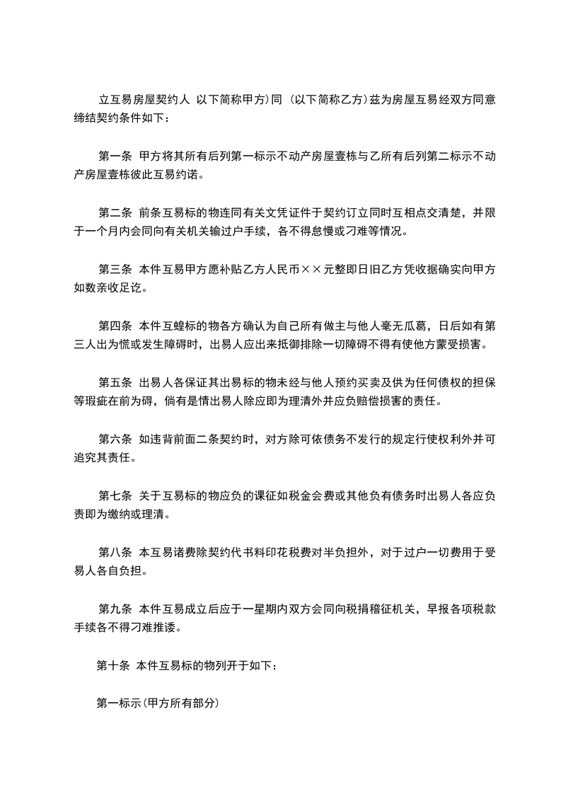 第一条 甲方将其所有后列第一标示不动产房屋壹栋与乙所有后列第二标示不动产房屋壹栋彼此互易约诺。