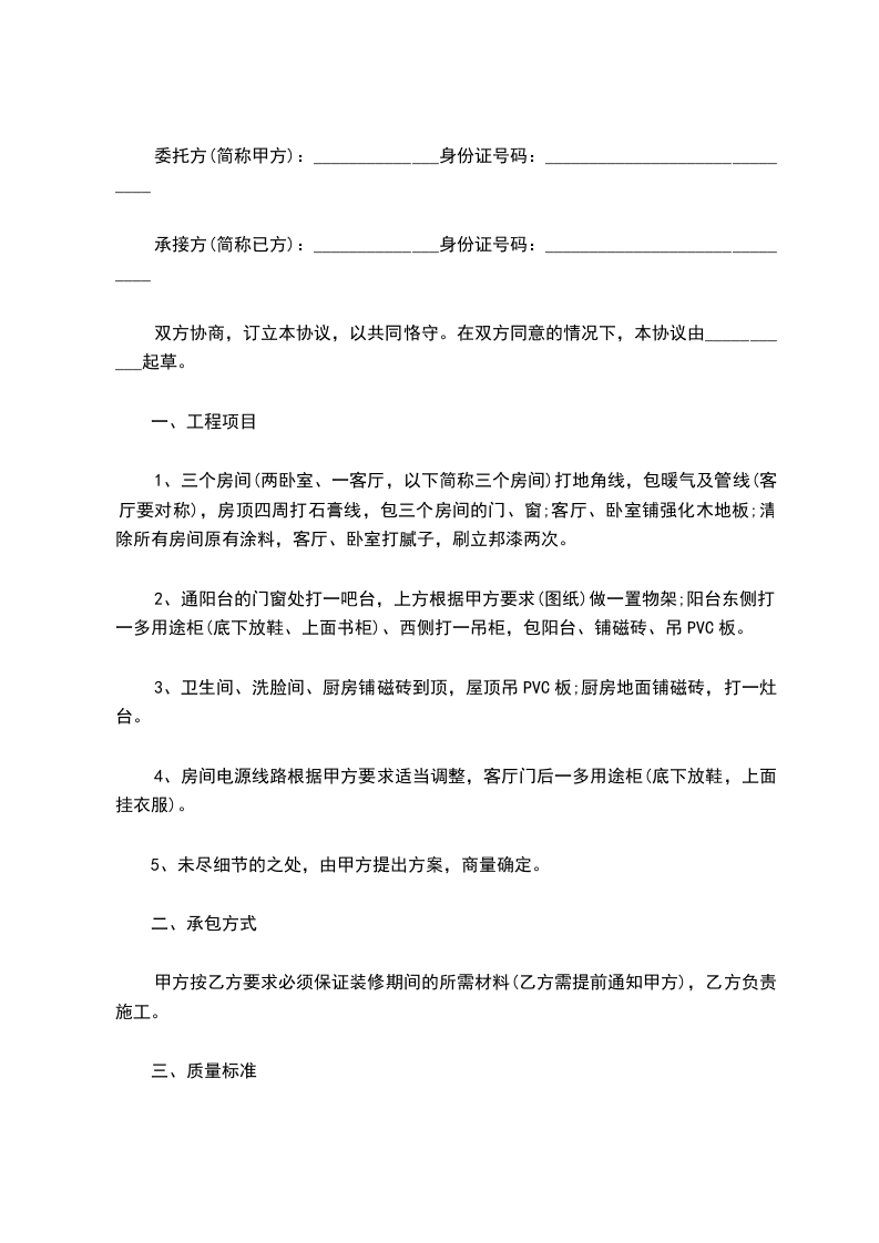 装修项目的具体要求,由甲方提出,乙方实施。本协议未尽事宜,由双方协商解决。本协议自双方签字之日起生效。