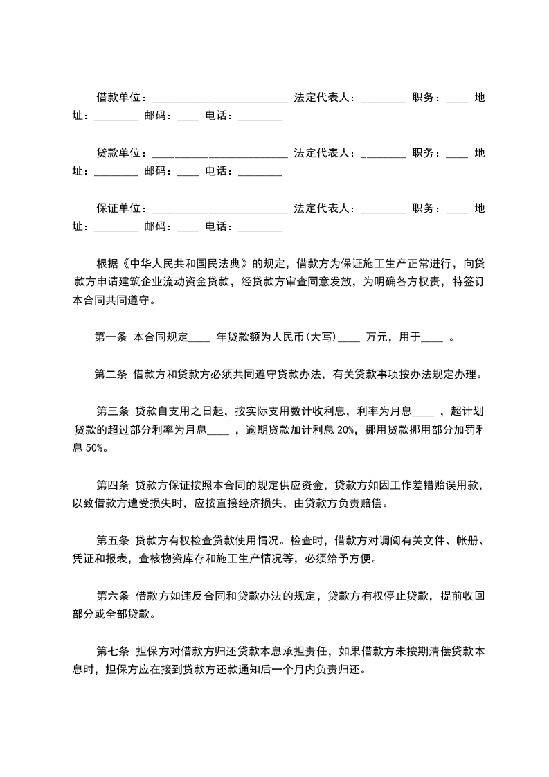 根据《中华人民共和国民法典》的规定,借款方为保证施工生产正常进行,向贷款方申请建筑企业流动资金贷款,经贷款方审查同意发放,为明确各方权责,特签订本合同共同遵守。