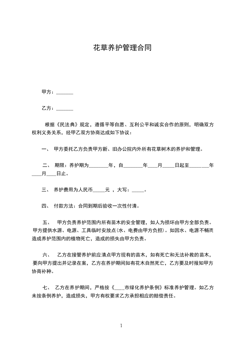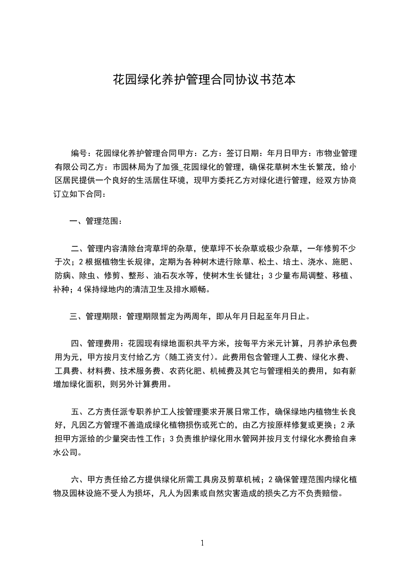 五、 甲方负责养护范围内所有苗木的安全管理,如人为损坏由甲方全部负责。甲方提供水源、电源、工具临时安放点(水、电费由甲方负担)。如因水、电源不畅而造成养护范围内的植物死亡,造成的损失由甲方负责。