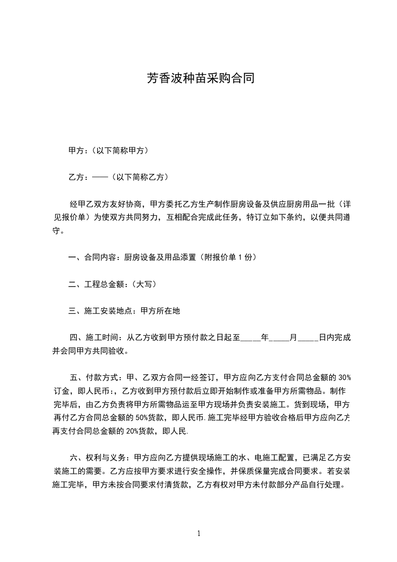 经甲乙双方友好协商,甲方委托乙方生产制作厨房设备及供应厨房用品一批(详见报价单)为使双方共同努力,互相配合完成此任务,特订立如下条约,以便共同遵守。