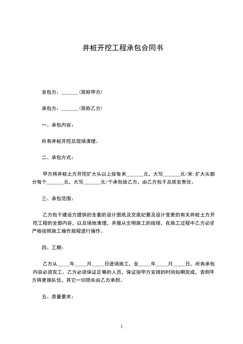 甲方将井桩土方开挖扩大头以上按每米_______元,大写_______元/米;扩大头部分每个_______元,大写_______元/个承包给乙方,由乙方包干及质安责任。