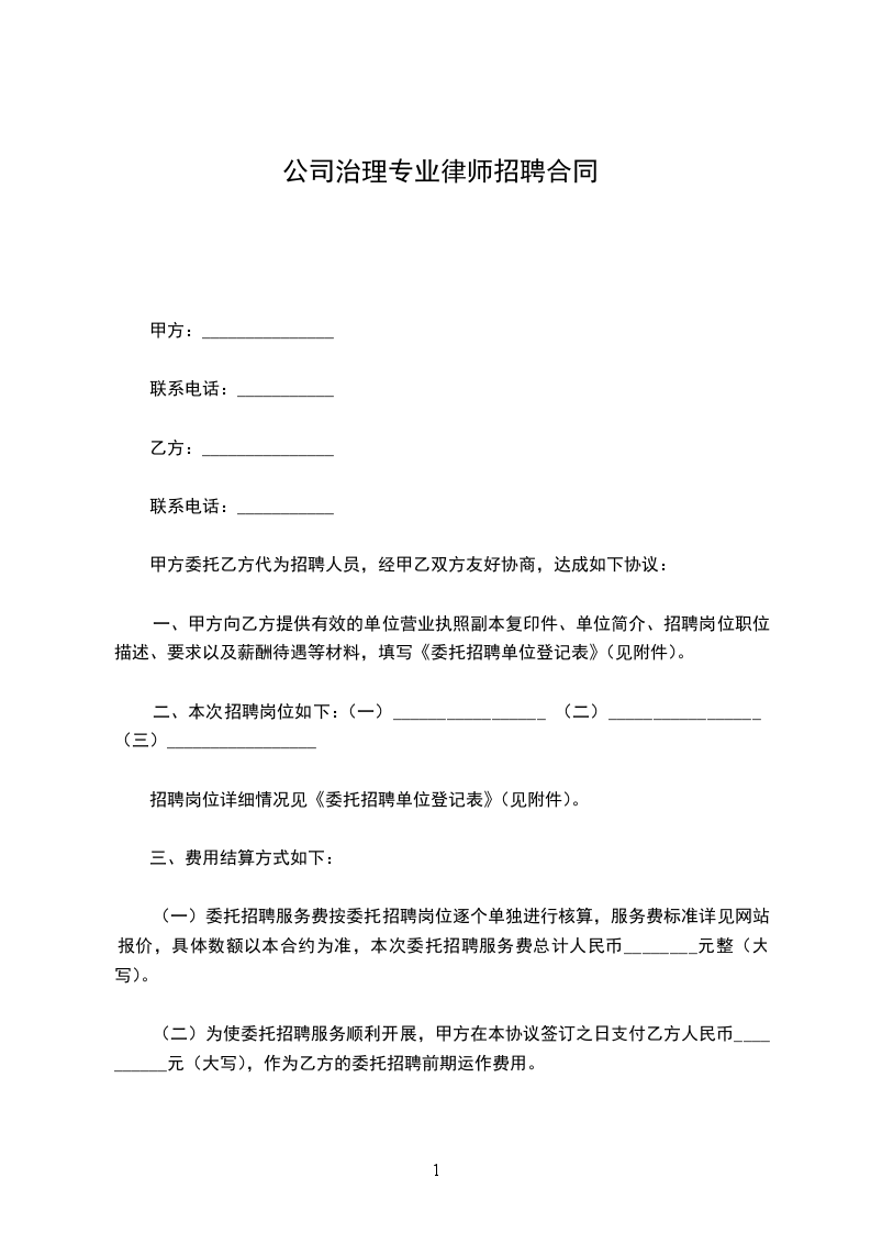 公司治理专业律师招聘合同