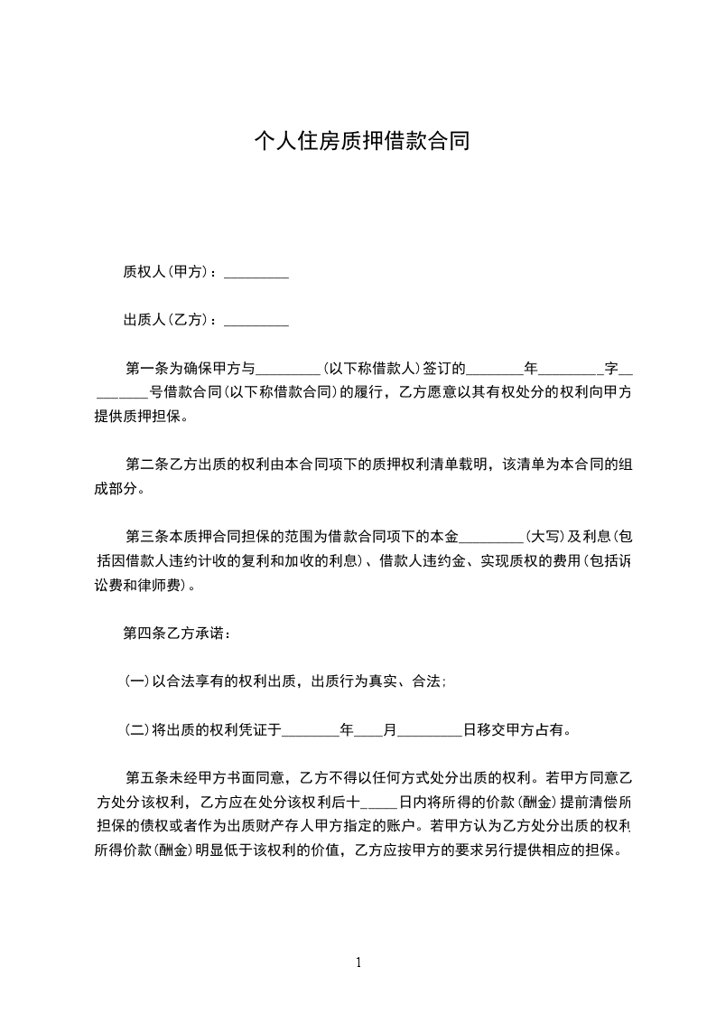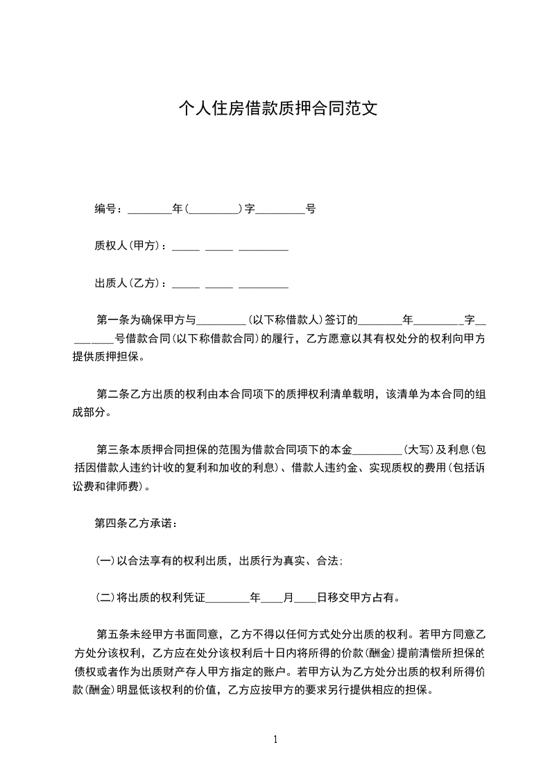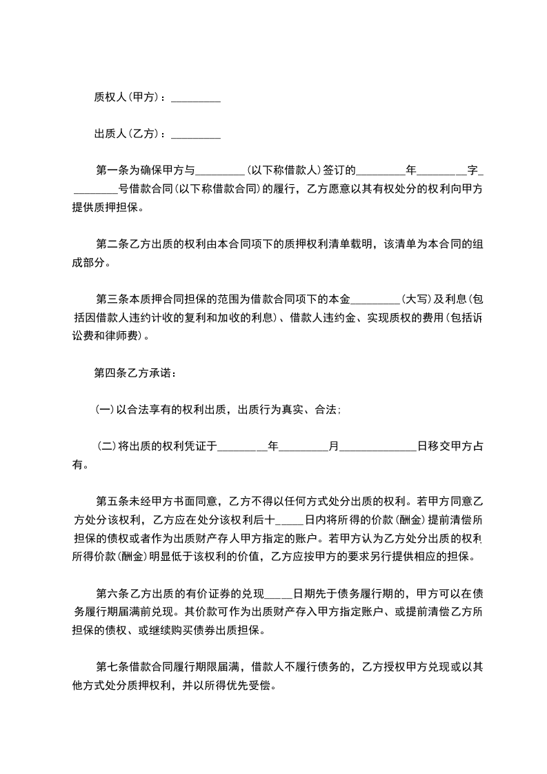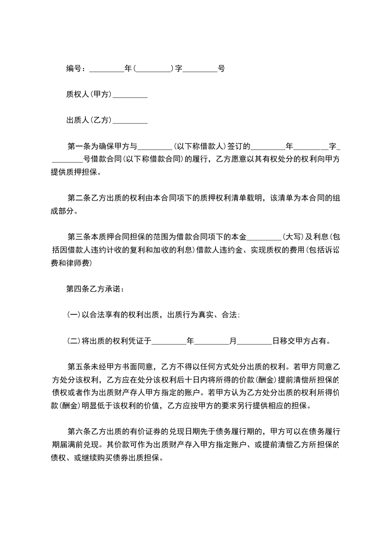第一条为确保甲方与_________(以下称借款人)签订的________年_________字_________号借款合同(以下称借款合同)的履行,乙方愿意以其有权处分的权利向甲方提供质押担保。
