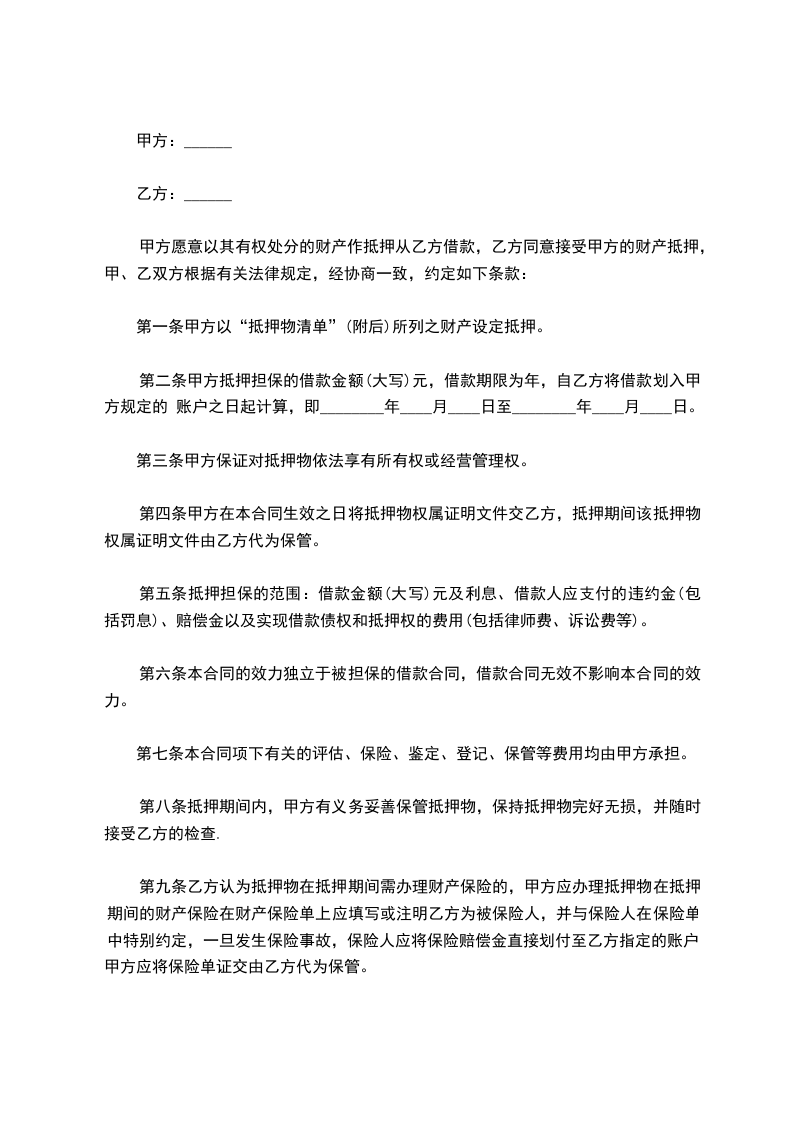 3.保险:在合同生效后五天内,甲方应向保险公司投保仓库财产保险,并将保险后的财产过户给乙方。投保的抵押物由于不可抗力遭受损失,乙方则从保险公司直接取得全部赔偿金作为归还所欠款的一部分。