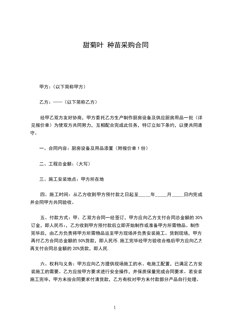 经甲乙双方友好协商,甲方委托乙方生产制作厨房设备及供应厨房用品一批(详见报价单)为使双方共同努力,互相配合完成此任务,特订立如下条约,以便共同遵守。