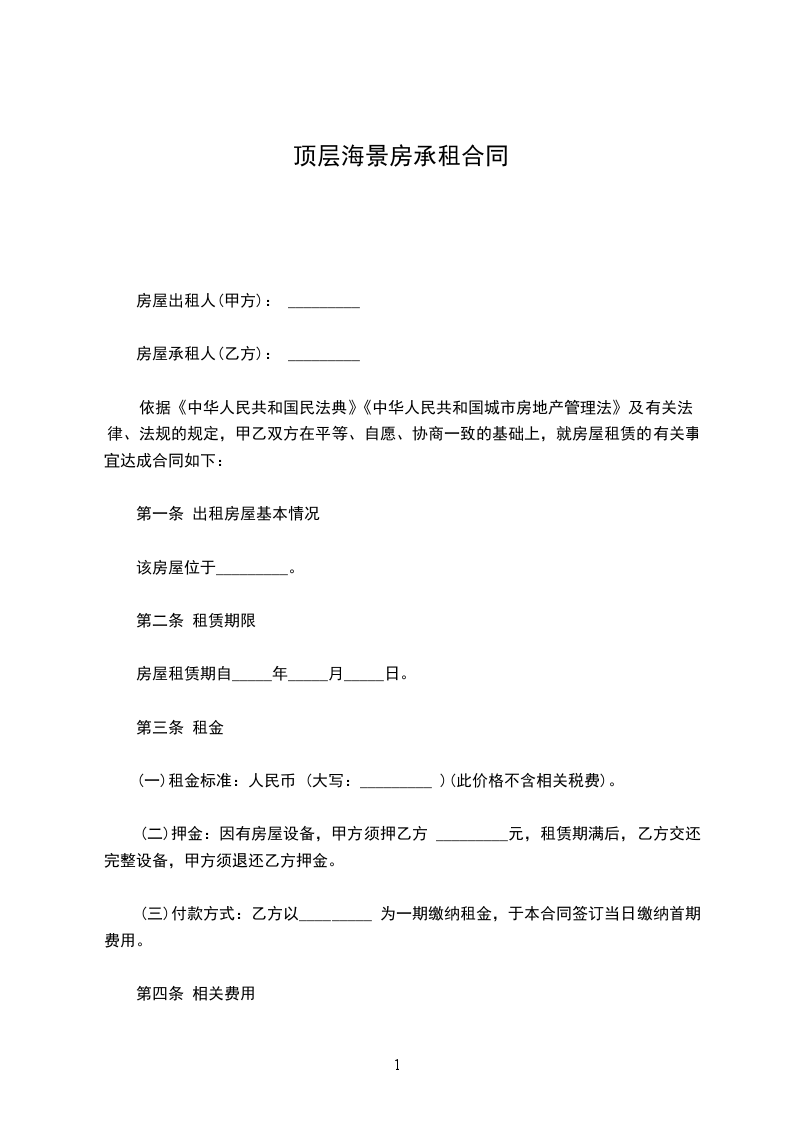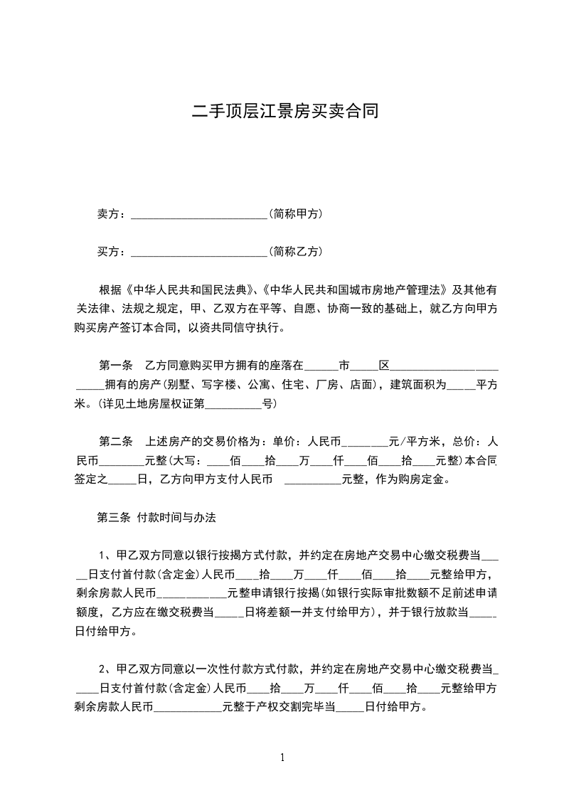 第二条 上述房产的交易价格为:单价:人民币________元/平方米,总价:人民币___________元整(大写:____佰____拾____万____仟____佰____拾____元整)。本合同签定之_____日,乙方向甲方支付人民币 __________元整,作为购房定金。