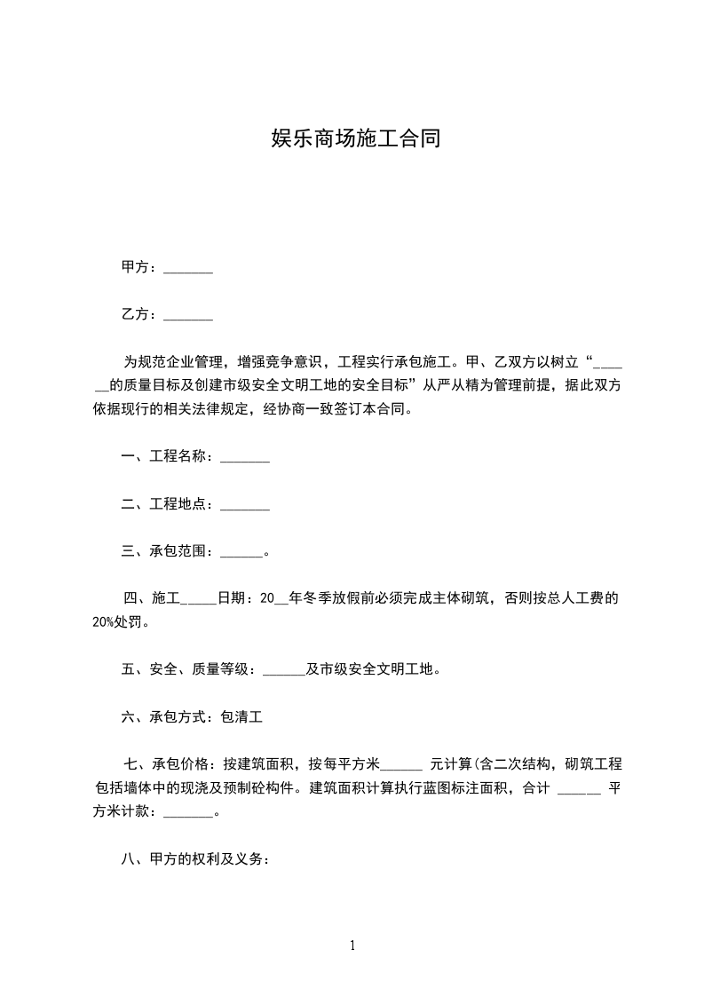 四、施工_____日期:20__年冬季放假前必须完成主体砌筑,否则按总人工费的20%处罚。