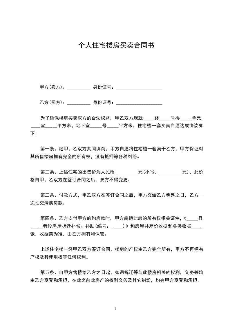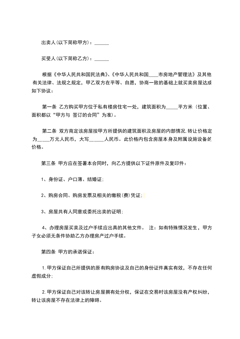 第一条 乙方购买甲方位于私有楼房住宅一处,建筑面积为_____平方米 (位置、面积都以“甲方与 签订的合同”为准)。