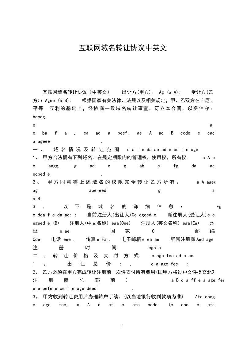 互联网域名转让协议(中英文) 出让方(甲方): Ag (a A): 受让方(乙方):Agee (a B): 根据国家有关法律、法规以及相关规定,甲、乙双方在自愿、平等、互利的基础上,经协商一致域名转让事宜,订立本合同,以资信守: Accdg