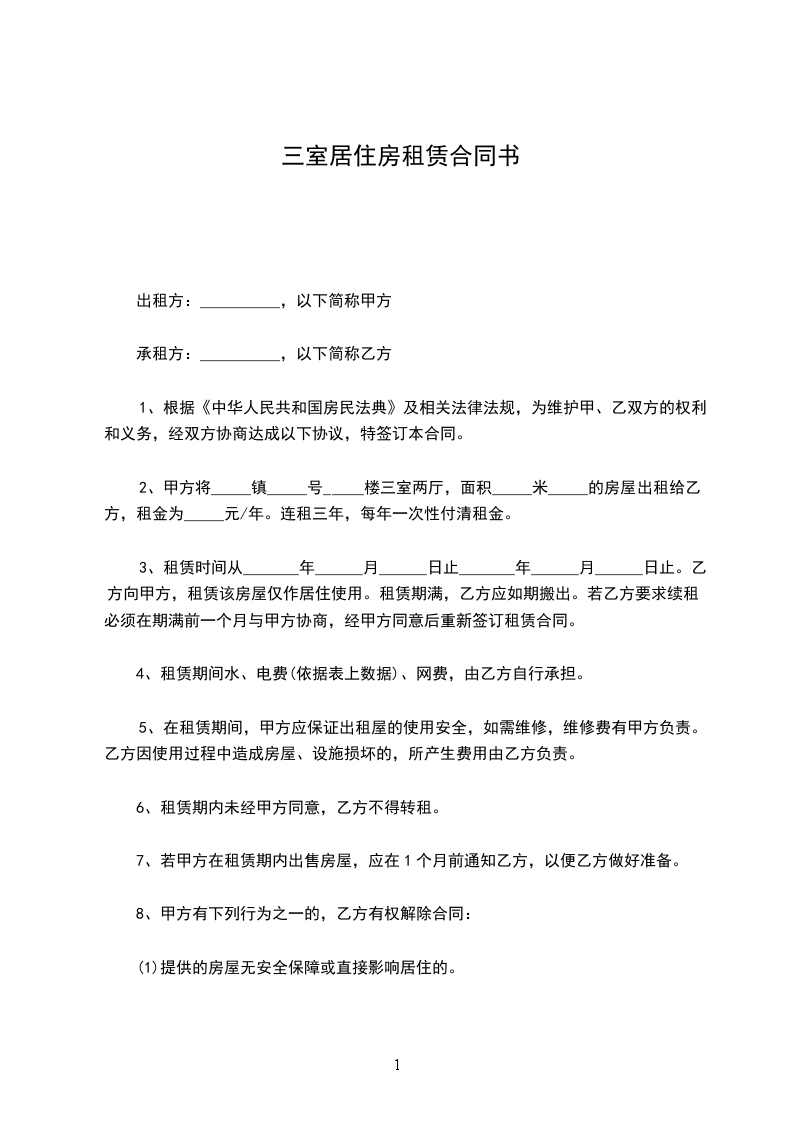 2、甲方将_____镇_____号_____楼三室两厅,面积_____米_____的房屋出租给乙方,租金为_____元/年。连租三年,每年一次性付清租金。
