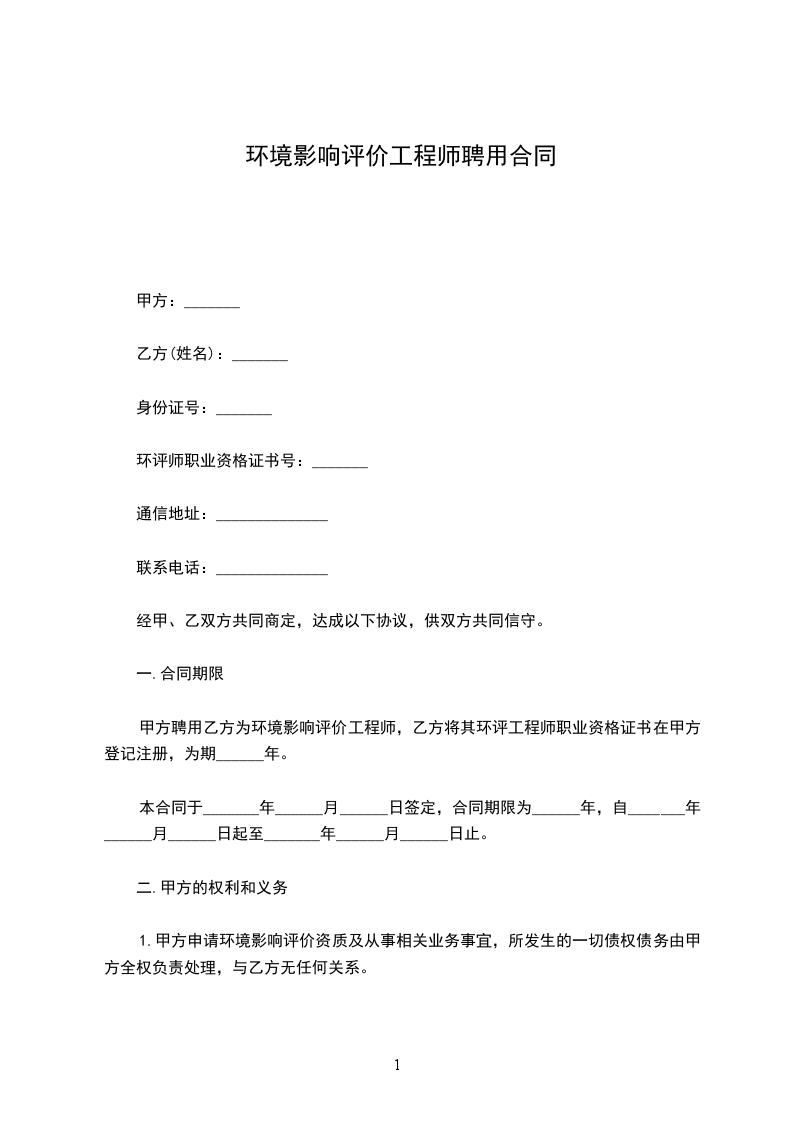 甲方聘用乙方为环境影响评价工程师,乙方将其环评工程师职业资格证书在甲方登记注册,为期______年。
