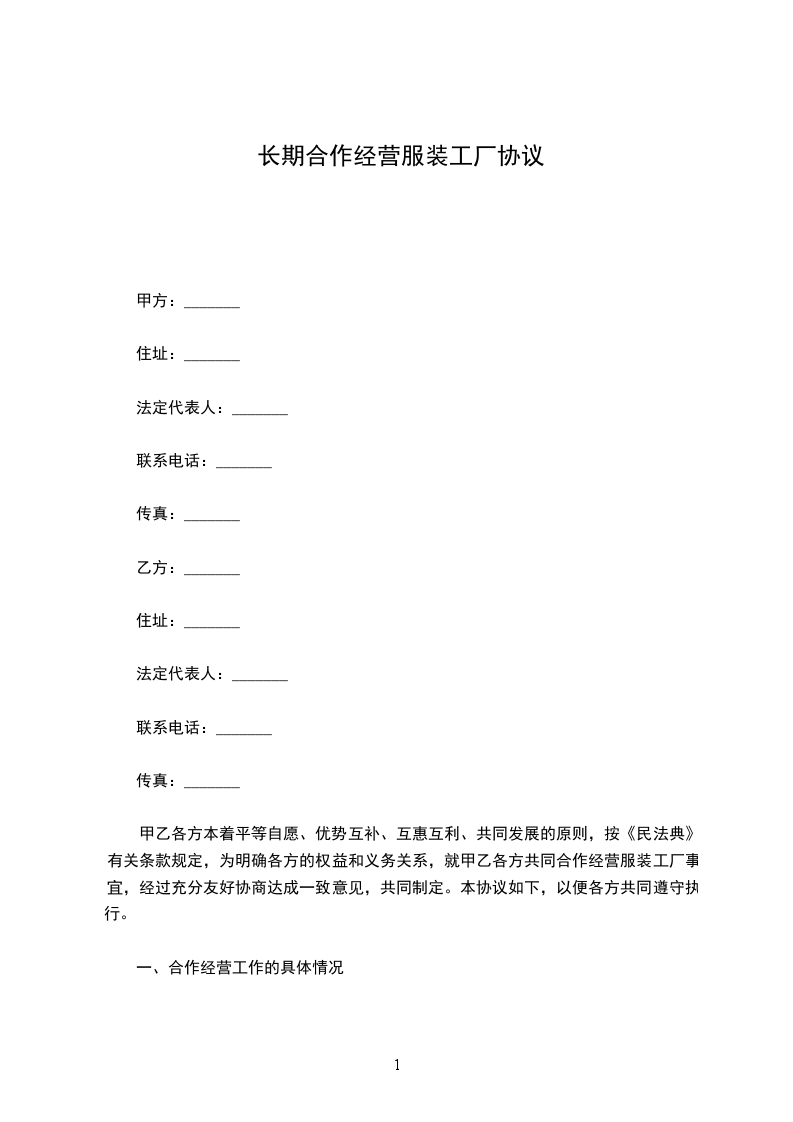甲乙各方本着平等自愿、优势互补、互惠互利、共同发展的原则,按《民法典》有关条款规定,为明确各方的权益和义务关系,就甲乙各方共同合作经营服装工厂事宜,经过充分友好协商达成一致意见,共同制定。本协议如下,以便各方共同遵守执行。