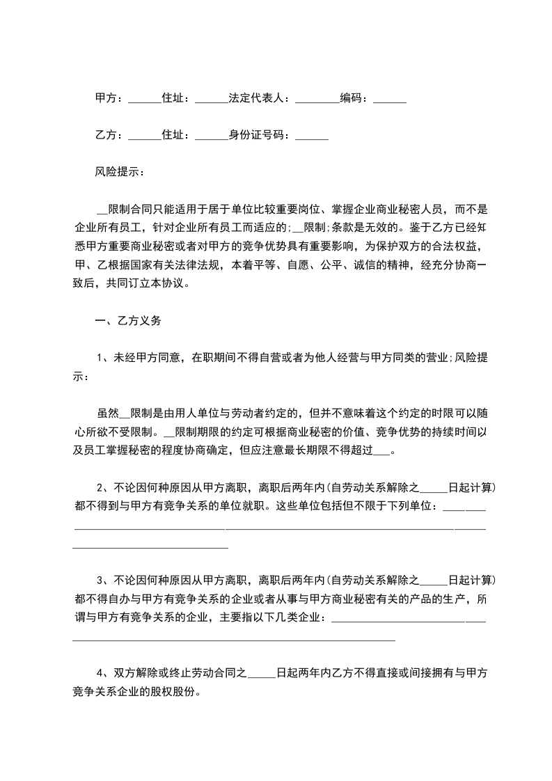 __限制合同只能适用于居于单位比较重要岗位、掌握企业商业秘密人员,而不是企业所有员工,针对企业所有员工而适应的;__限制;条款是无效的。鉴于乙方已经知悉甲方重要商业秘密或者对甲方的竞争优势具有重要影响,为保护双方的合法权益,甲、乙根据国家有关法律法规,本着平等、自愿、公平、诚信的精神,经充分协商一致后,共同订立本协议。