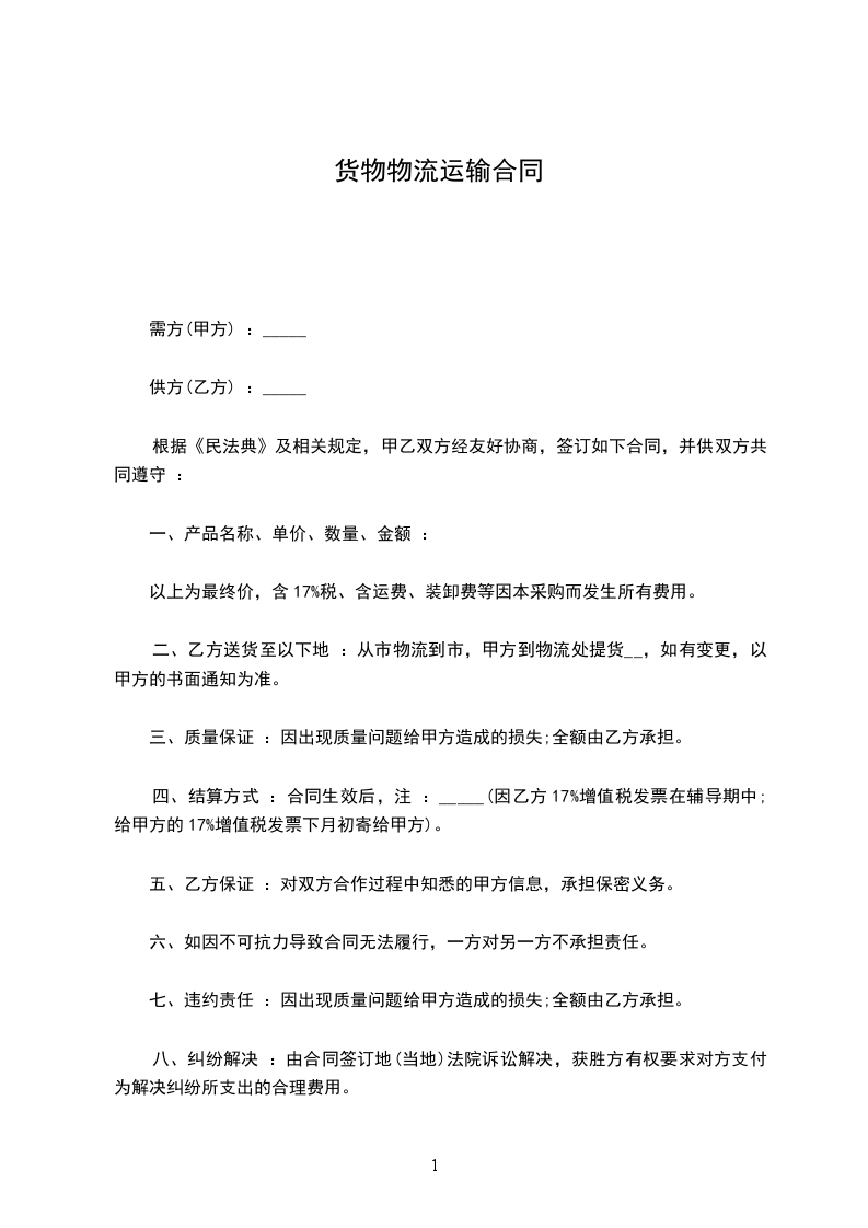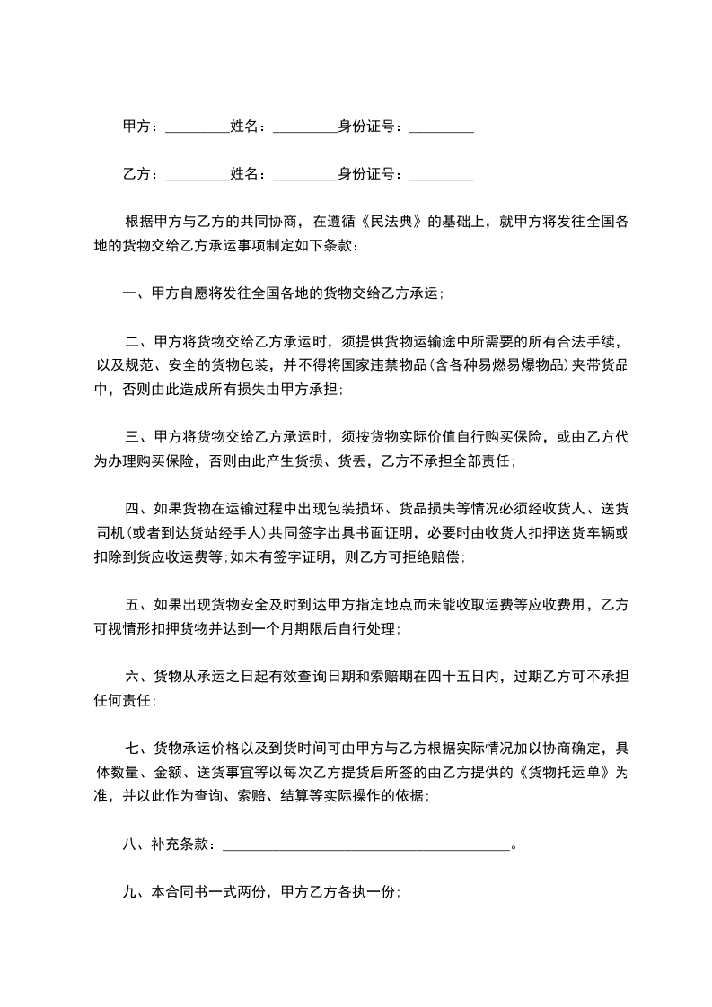 承运方:______________物流有限公司 (以下简称乙方)